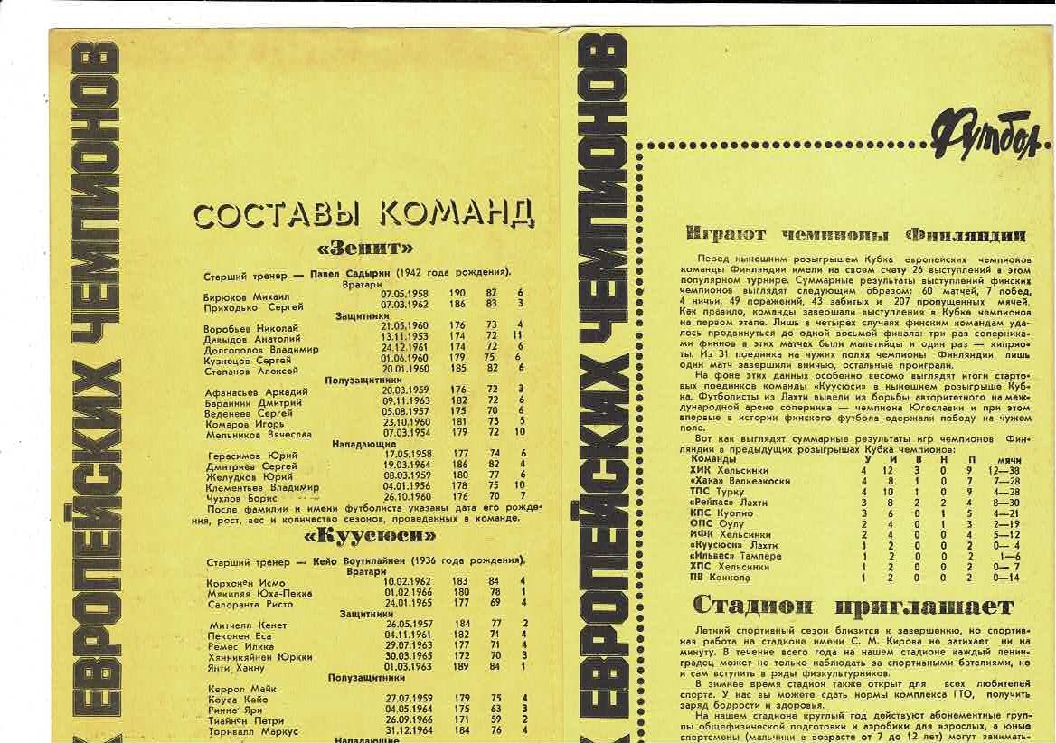 Zenit Leningrad v Kuusysi Lahti European Cup Football Programme 1985/86