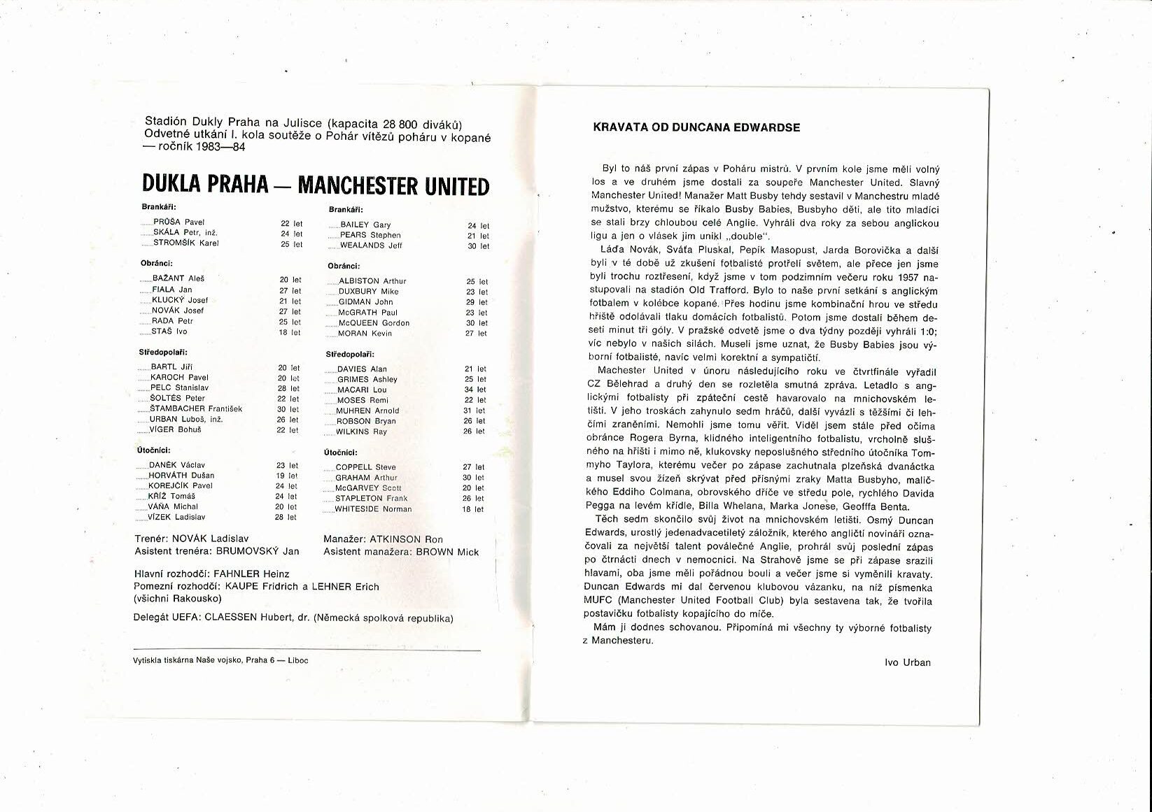 Dukla Prague v Manchester United European Cup Winners Cup Football Programme 1983/84