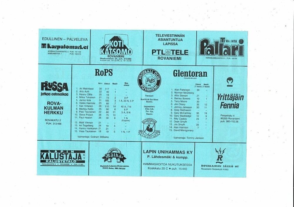 Rovaniemi v Glentoran European Cup Winners Cup Football Programme 1987/88