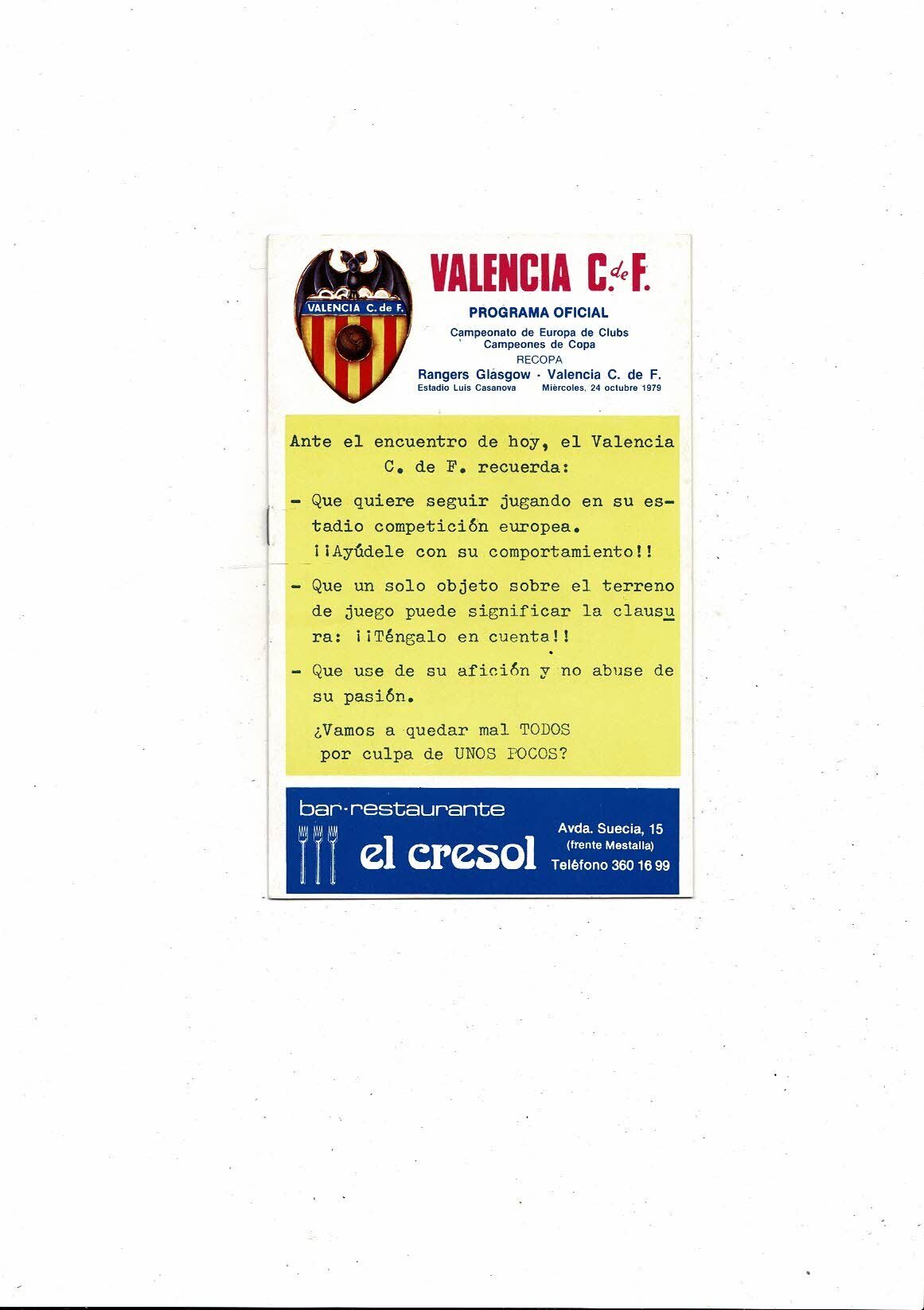 Valencia CF v Glasgow Rangers European Cup Winners' Cup Football Programme 1979/80