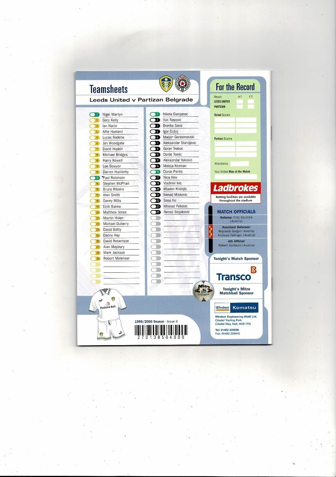 Leeds United v Partizan Belgrade UEFA Cup Football Programme 1999/00