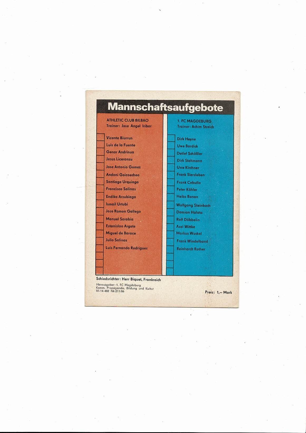Magdeburg v Bilbao UEFA Cup Football Programme 1986/87