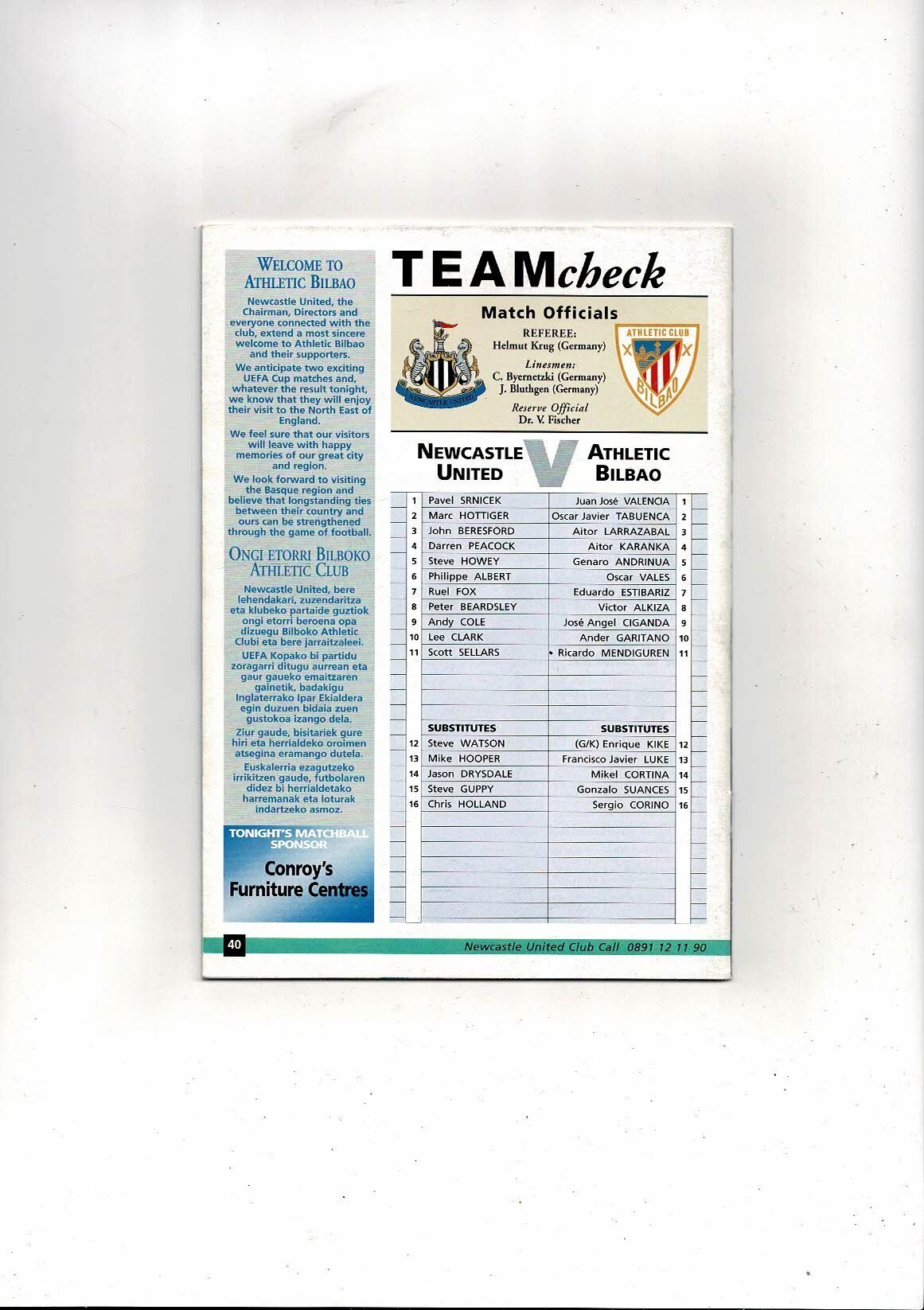 Newcastle United v Athletico Bilbao UEFA Cup Football Programme 1994/95