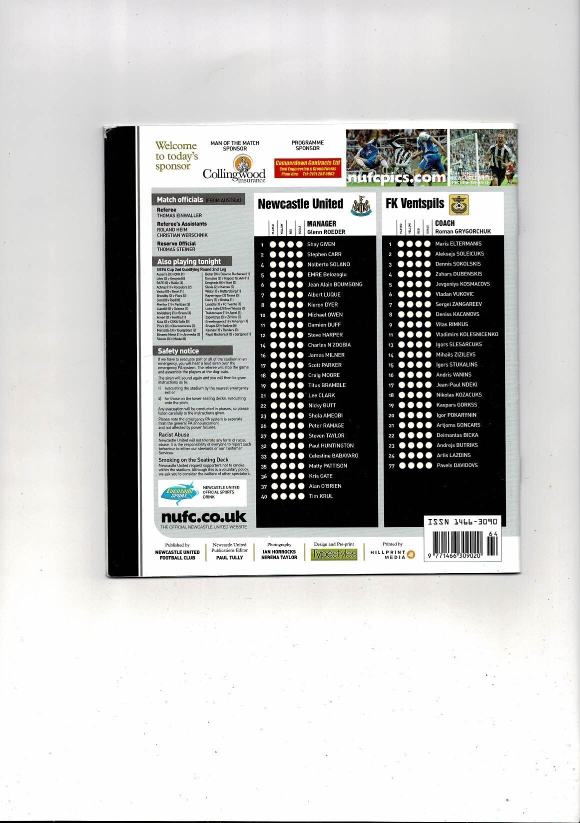 Newcastle United v FK Ventspils UEFA Cup Football Programme 2006/07