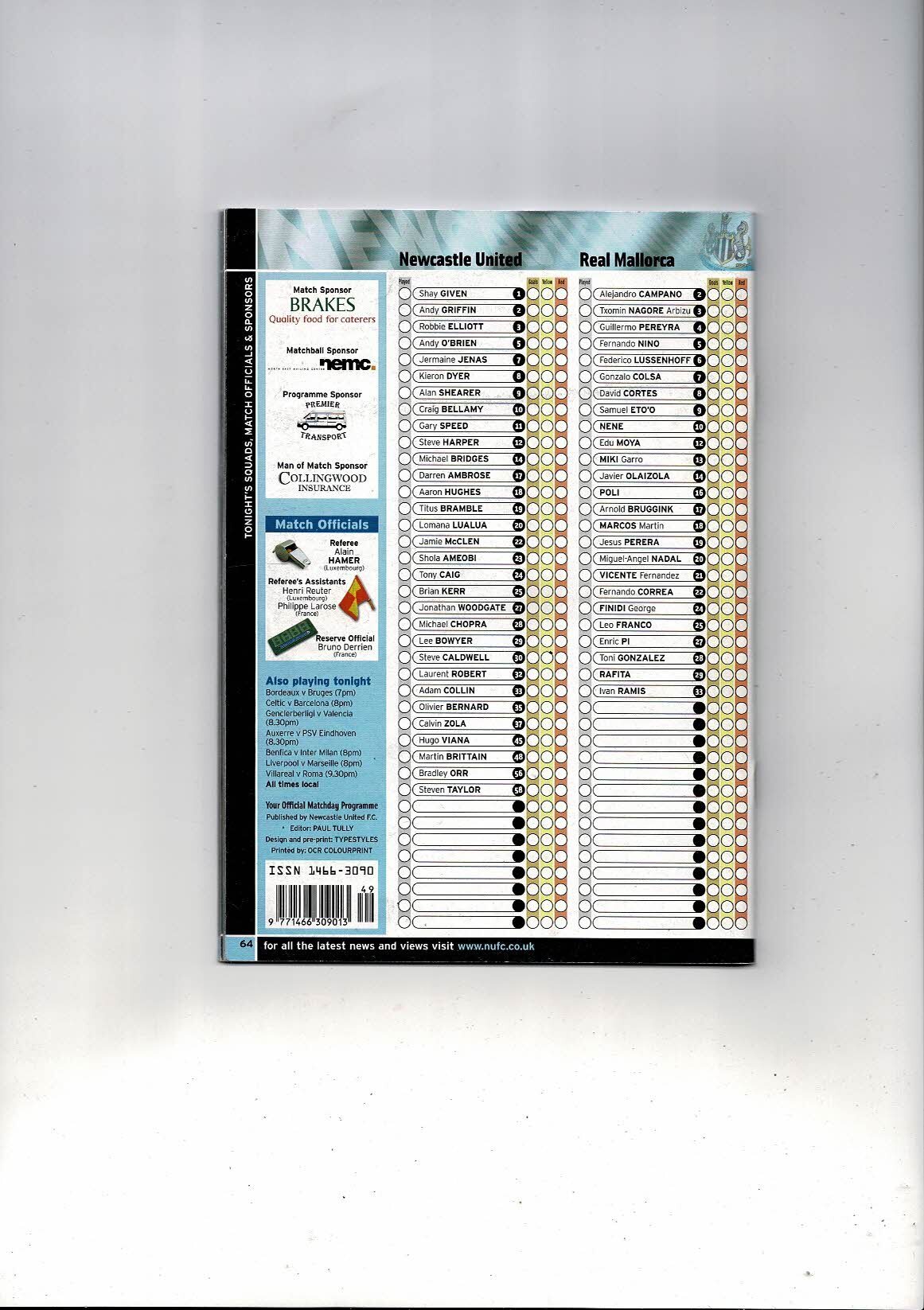Newcastle United v Real Mallorca UEFA Cup Football Programme 2003/04