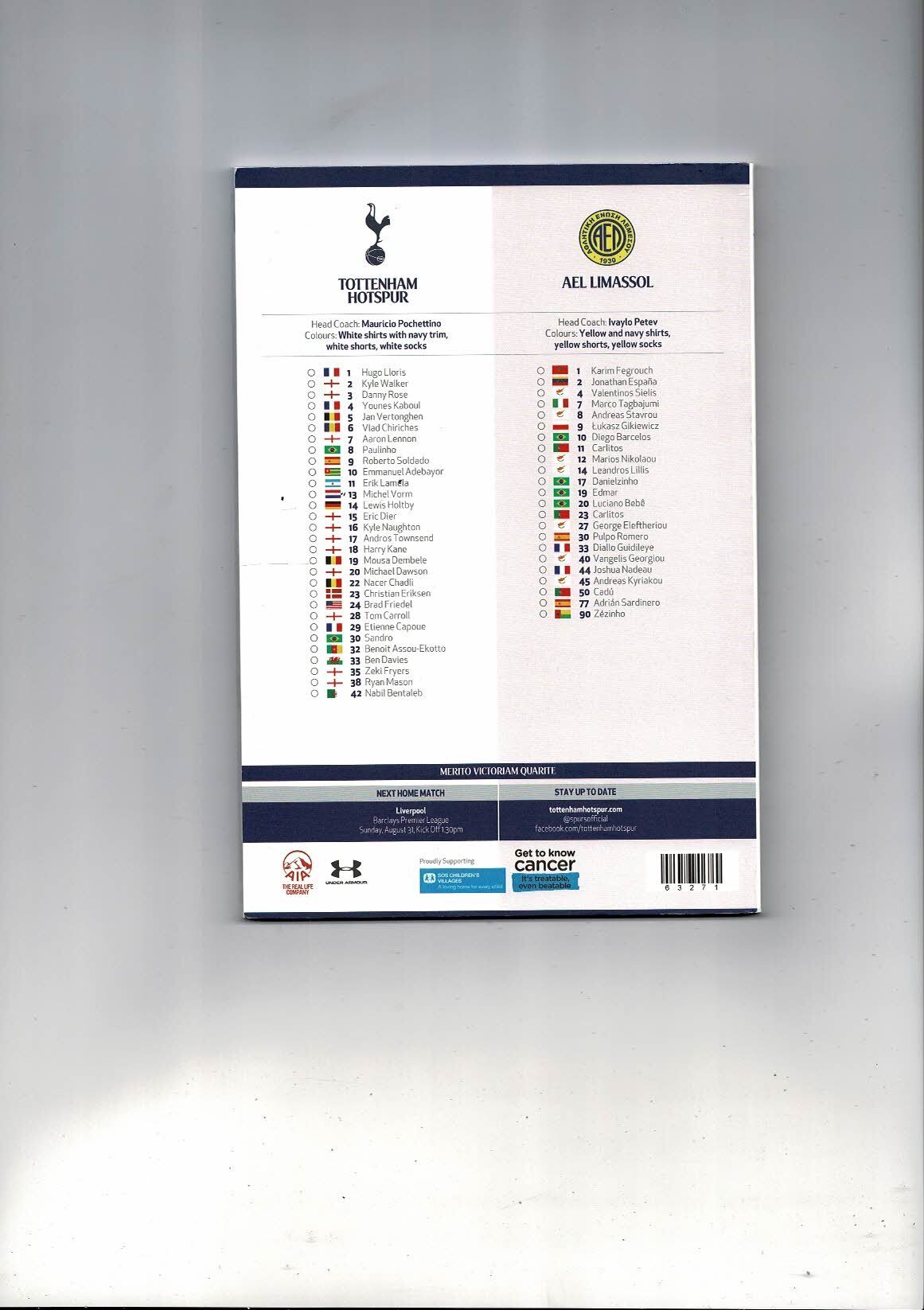 Tottenham Hotspur v AEL Limassol Europa League Football Programme 2014/15