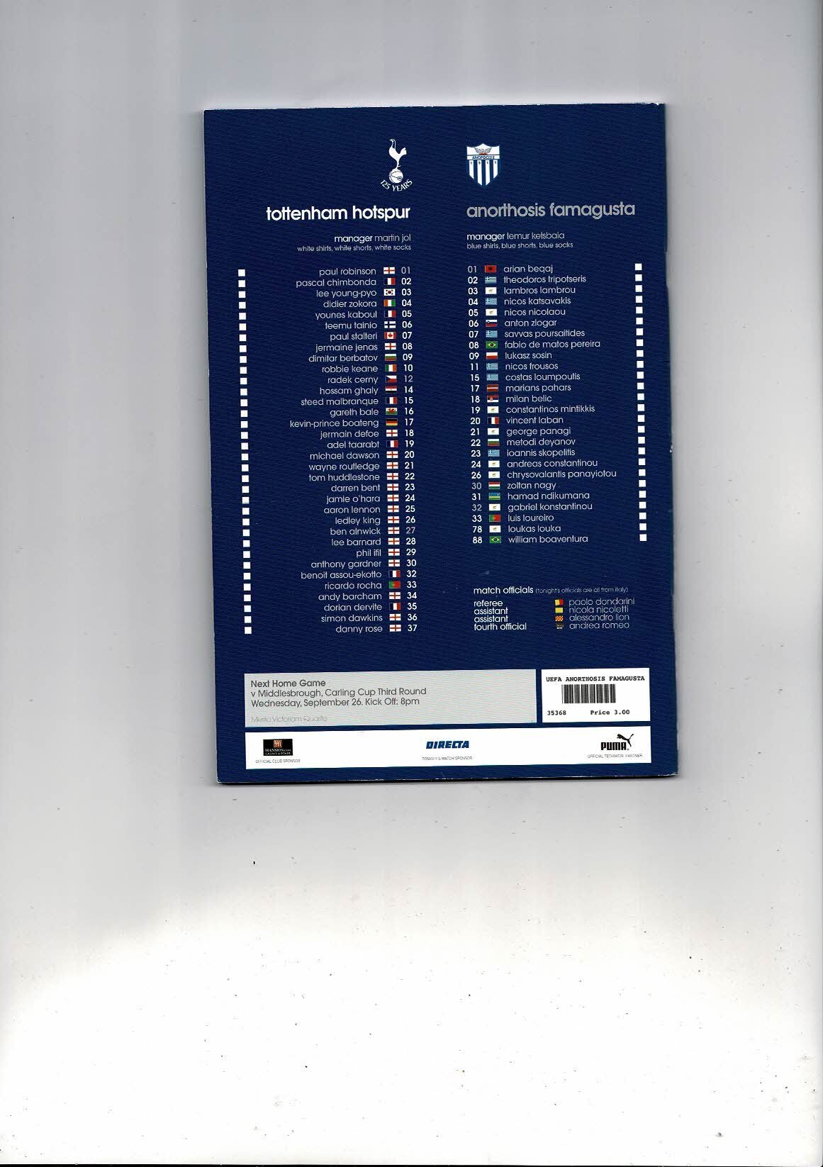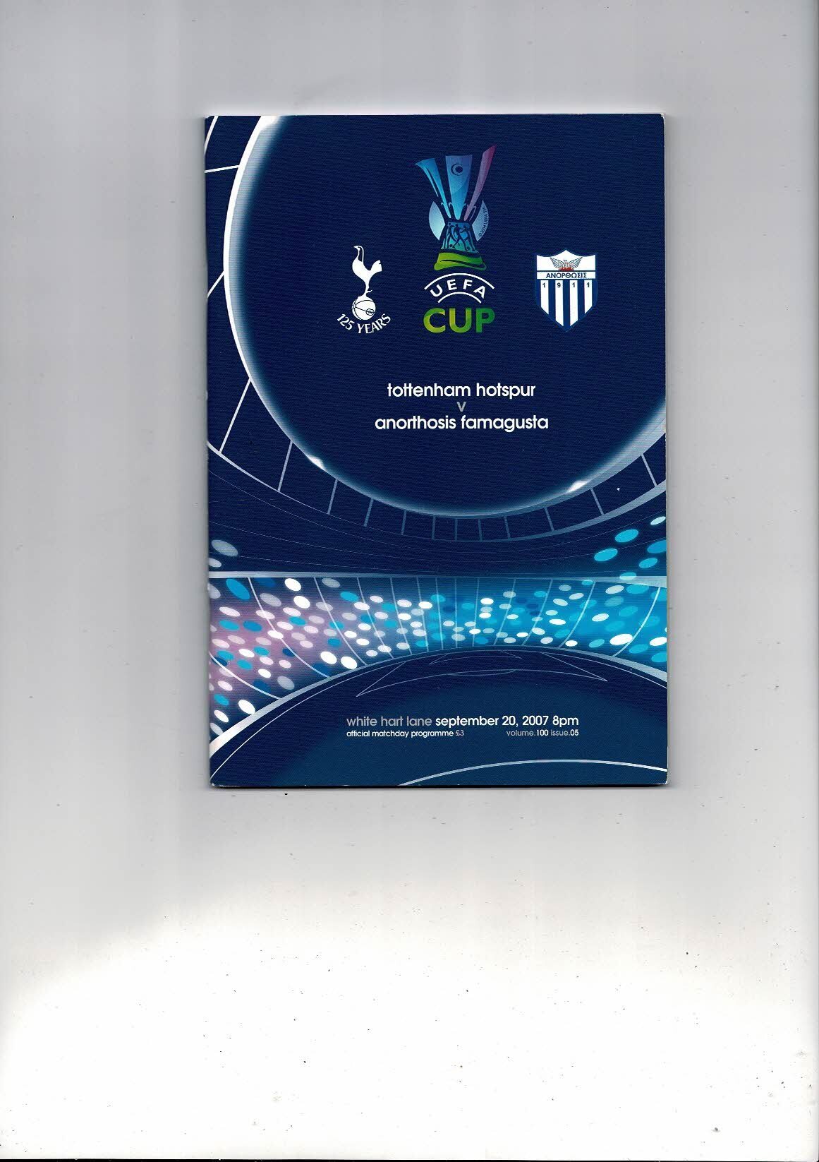 Tottenham Hotspur v Anorthosis Famagusta UEFA Cup Football Programme 2007/08
