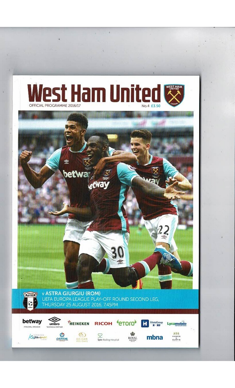 West Ham United v Astra Europa League Football Programme 2016/17