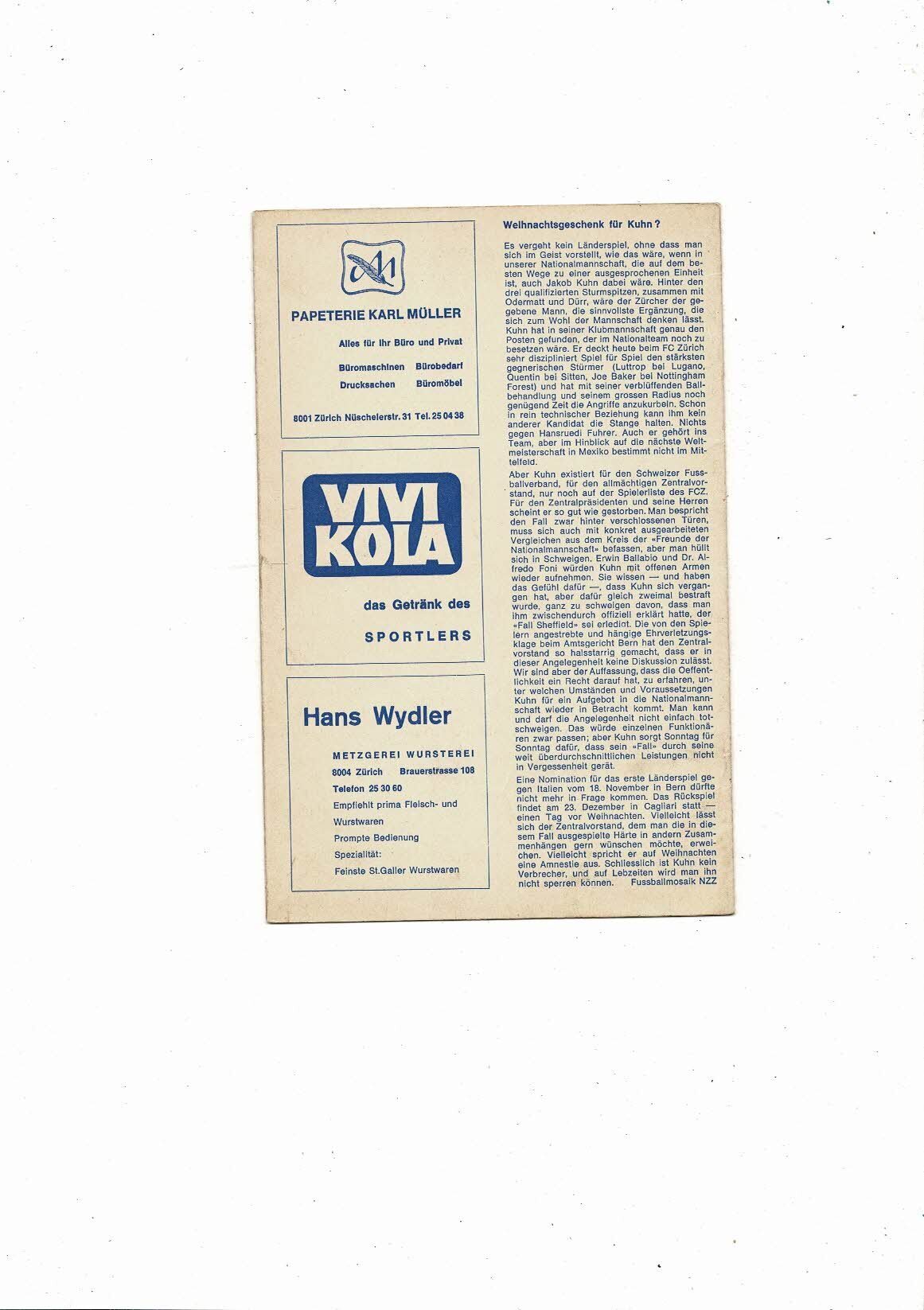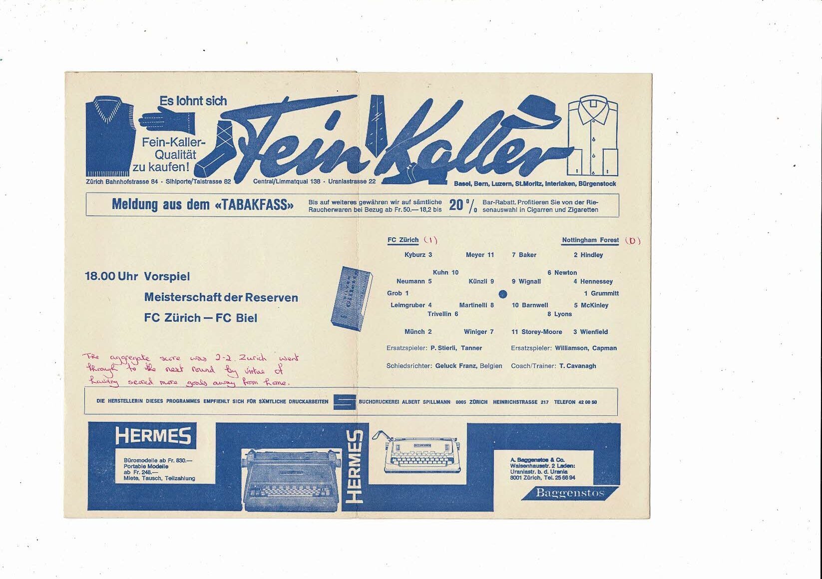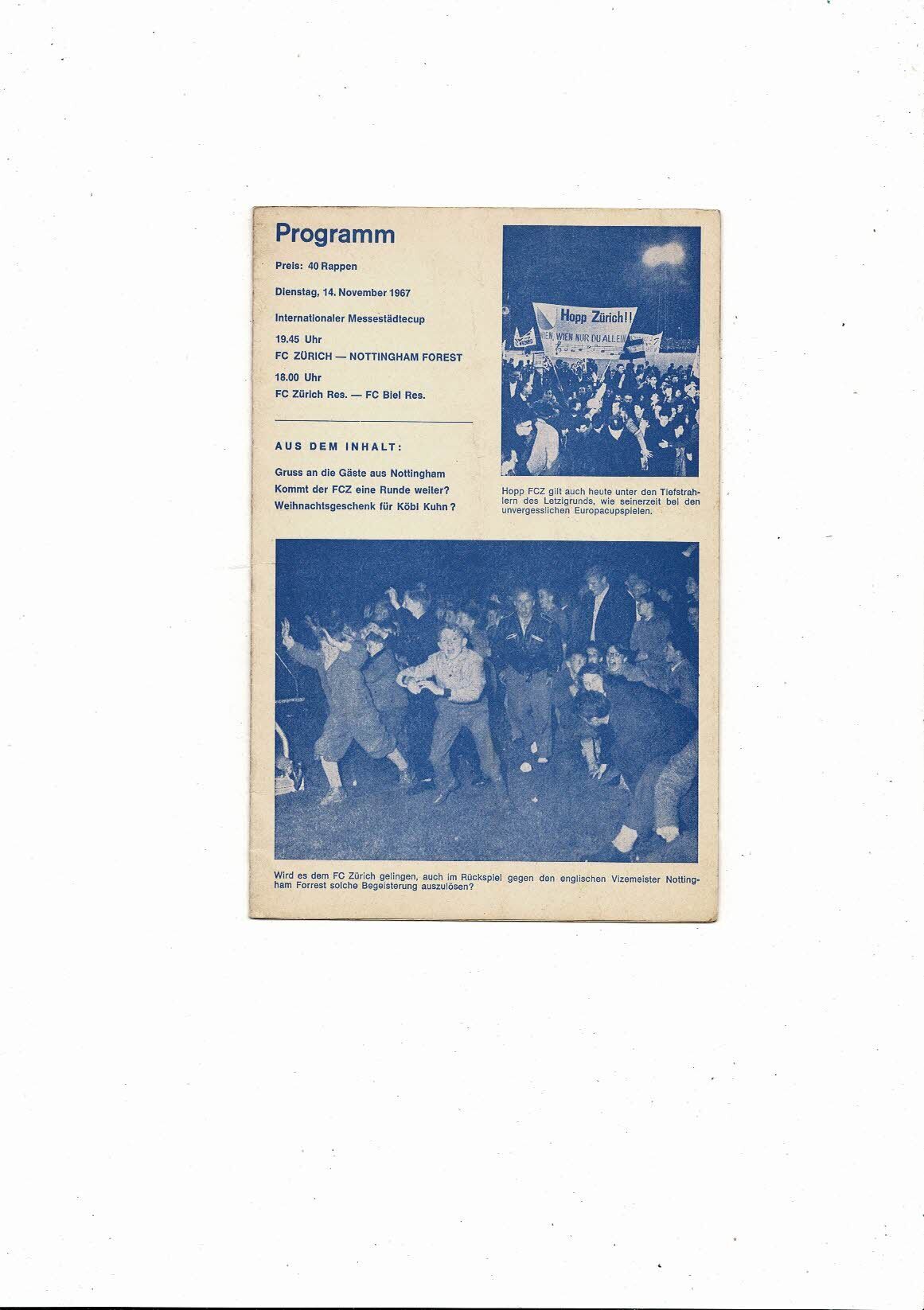 Zurich v Nottingham Forest Fairs Cup Football Programme 1967/68