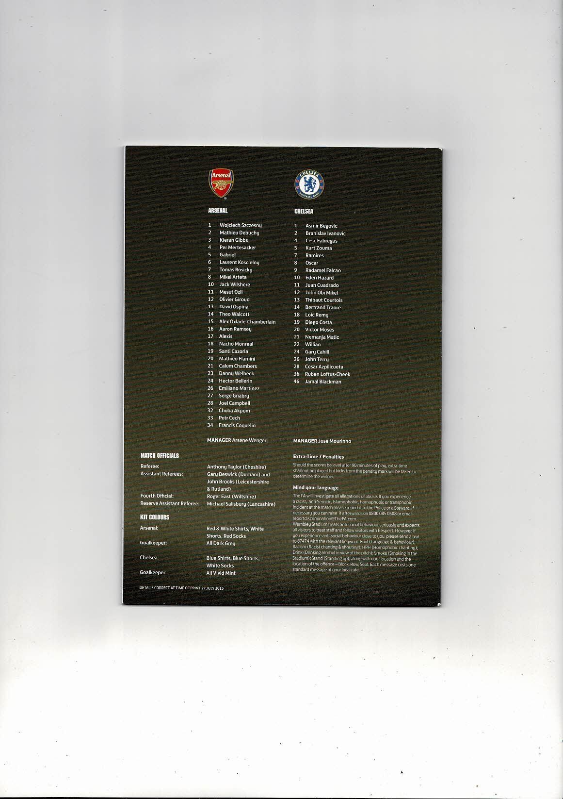 2015 Arsenal v Chelsea Charity Shield Football Programme