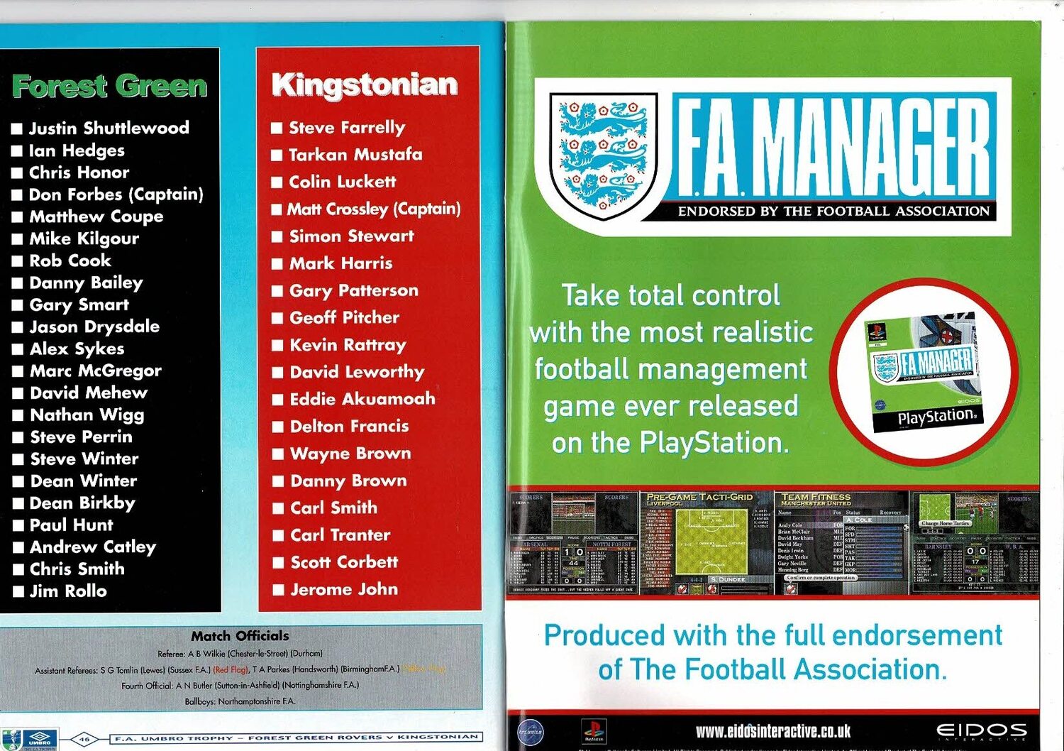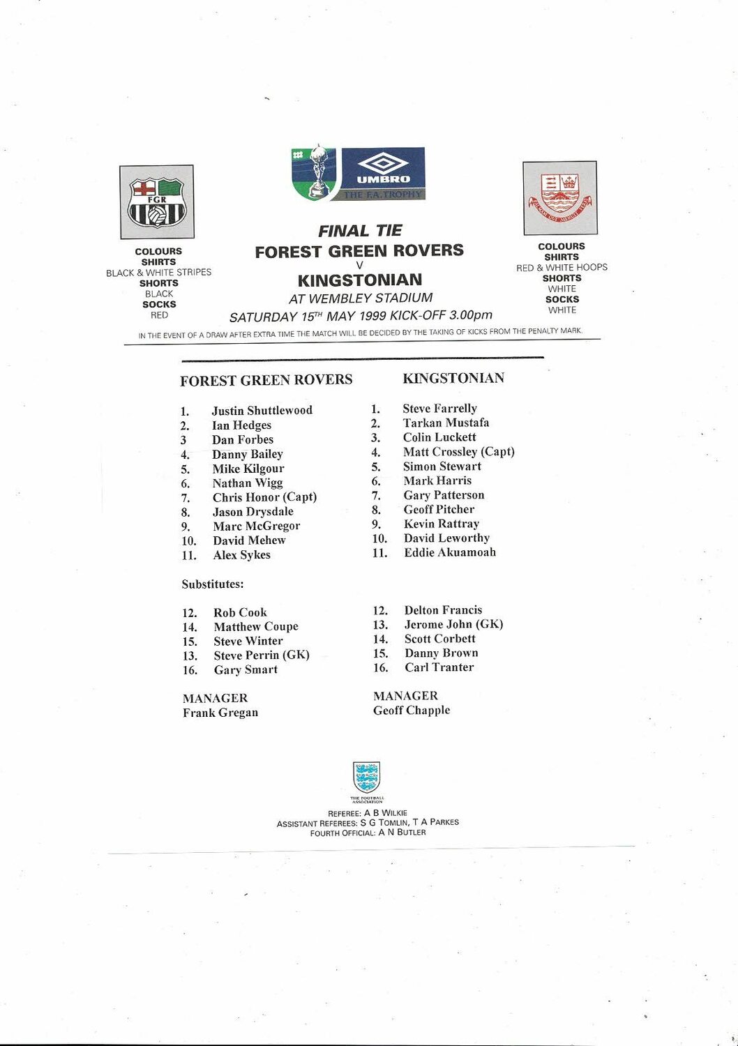 1999 Forest Green Rovers v Kingstonian FA Trophy Final Football Programme + Team Sheet