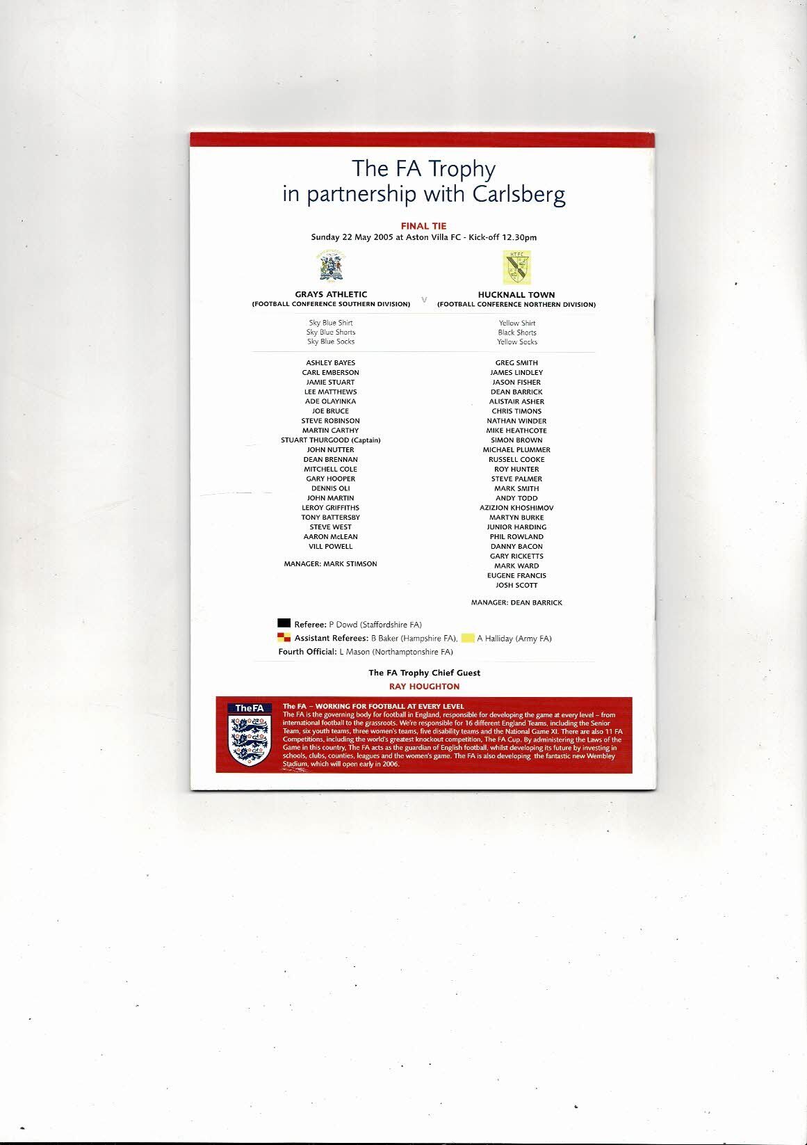 2005 Grays Athletic v Hucknall Town FA Trophy Final Football Programme @ Villa