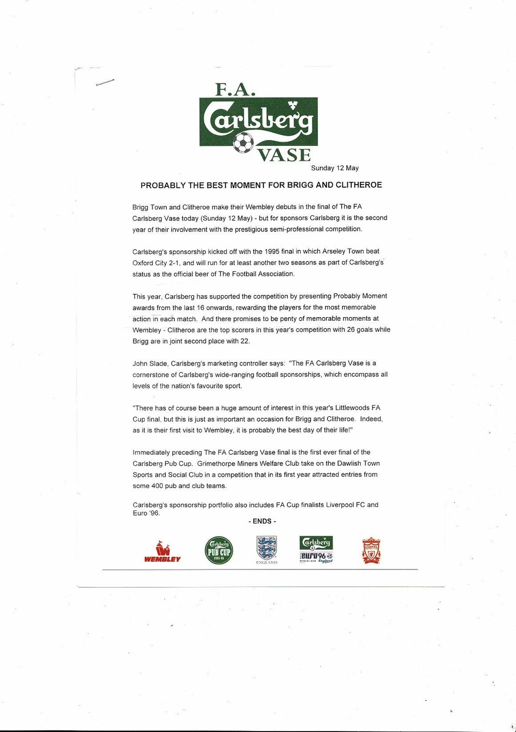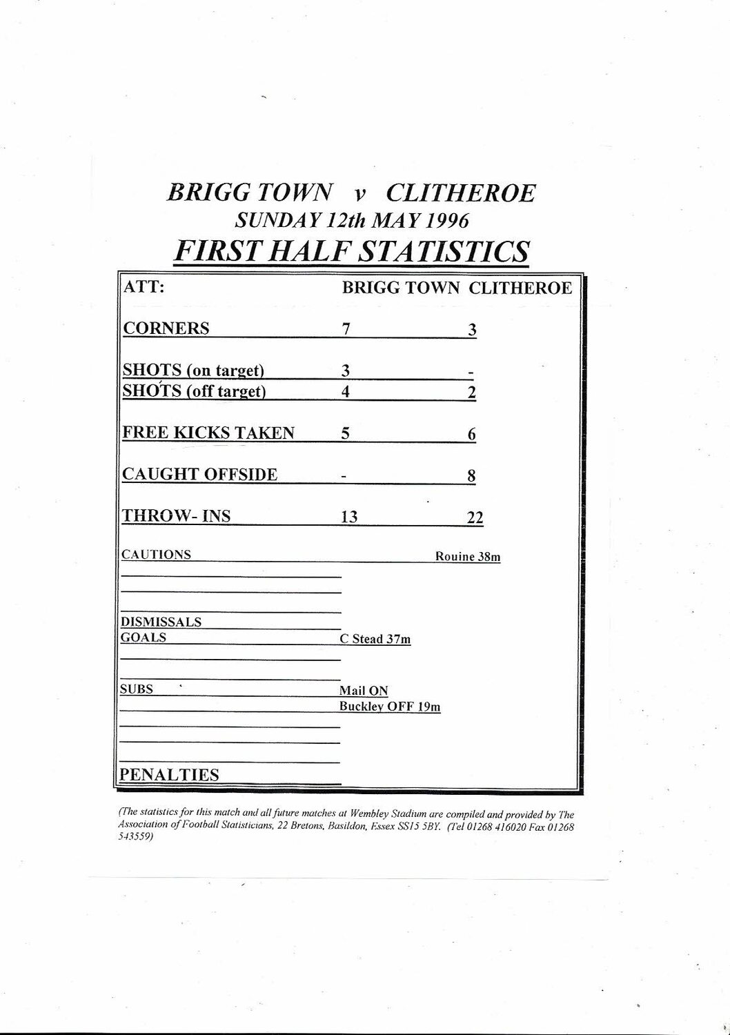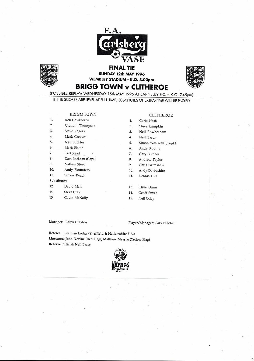 1996 Brigg Town v Clitheroe FA Vase Final Football Programme, Ticket, Team Sheet, Stat Sheet