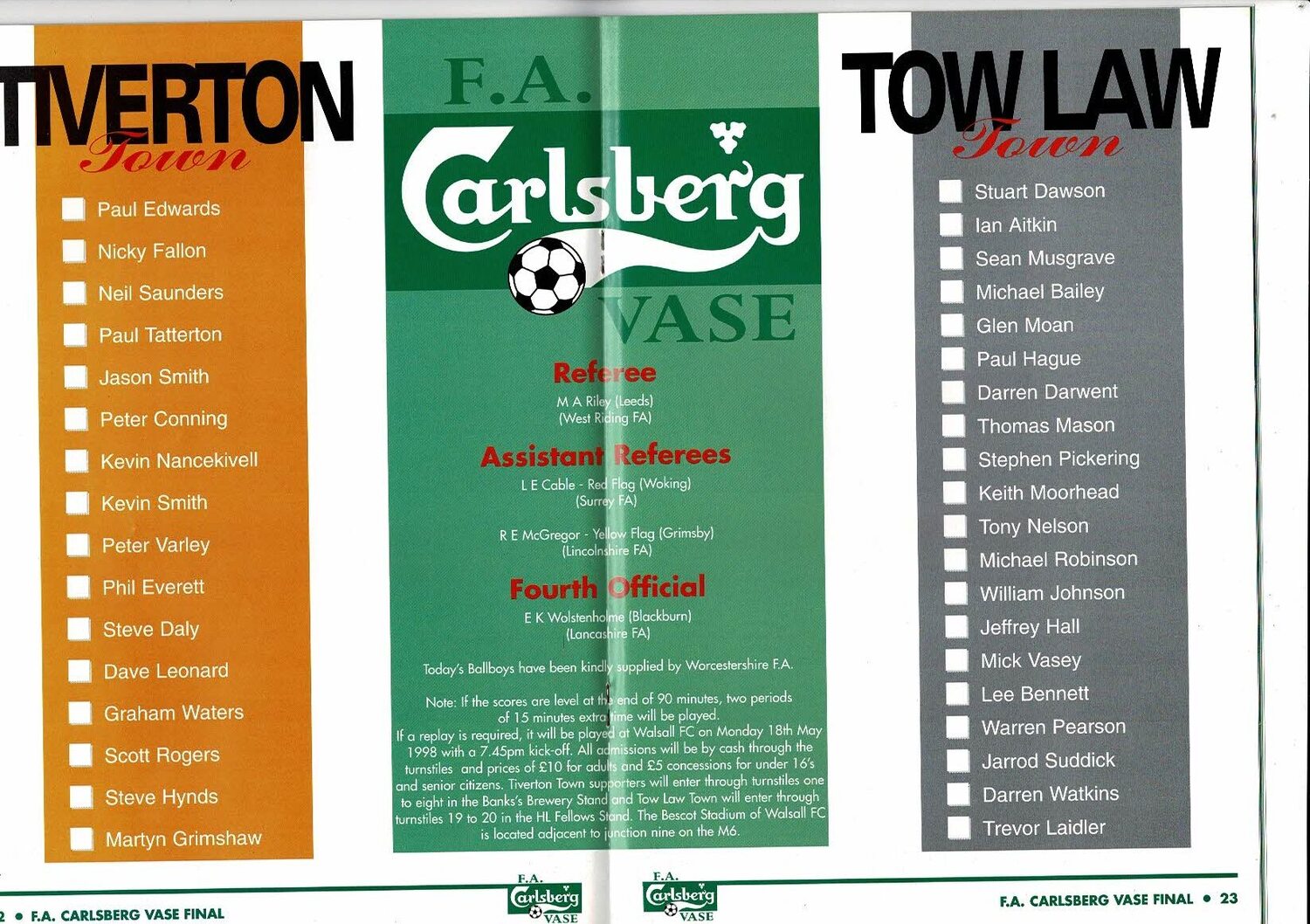1998 Tiverton Town v Tow Law Town FA Vase Final Football Programme