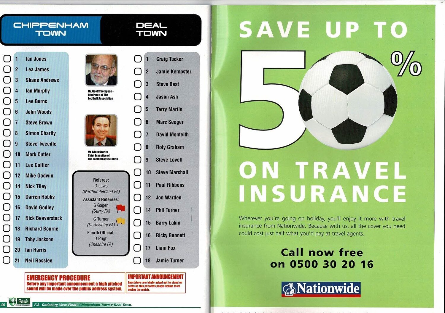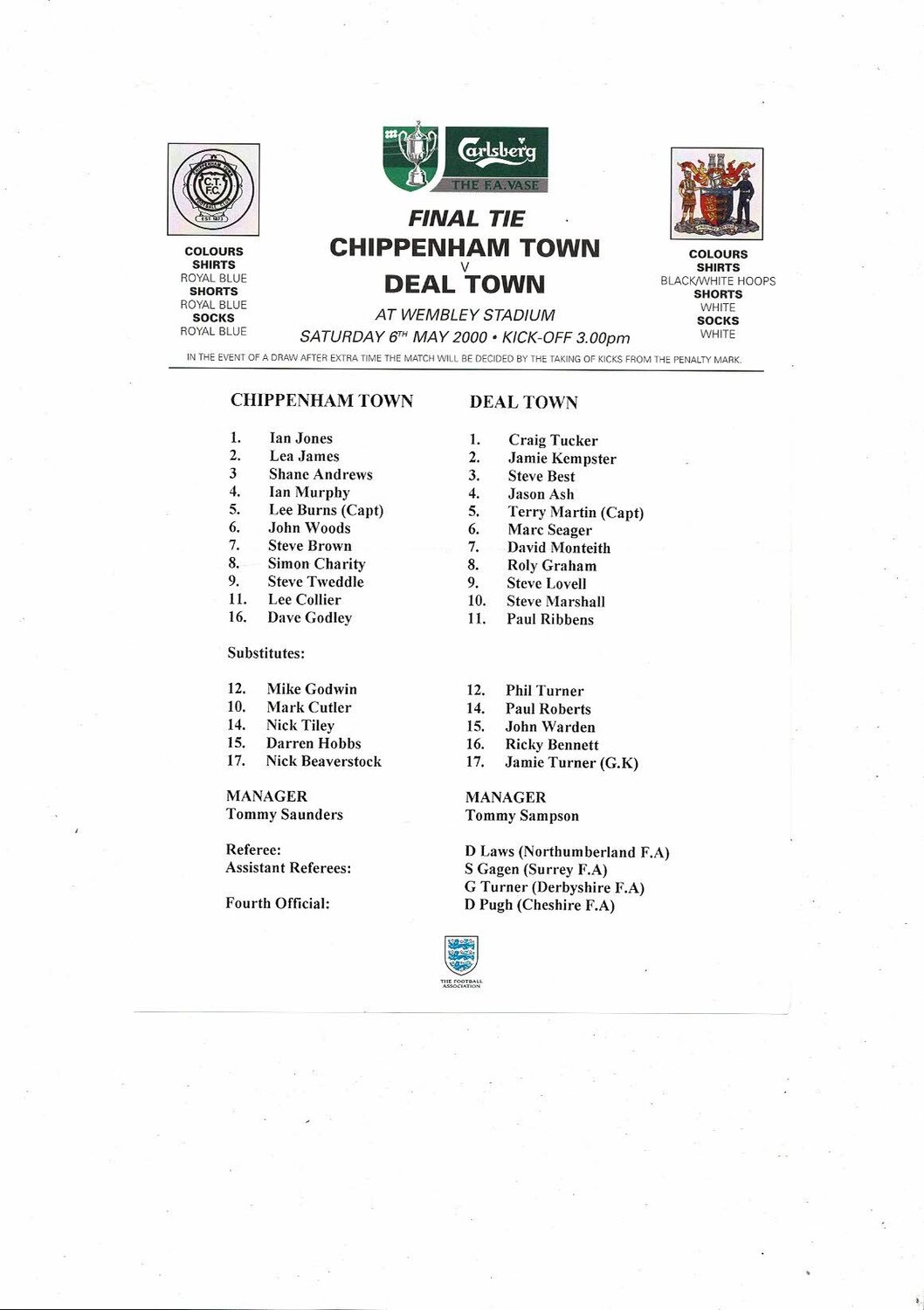 2000 Chippenham Town v Deal Town FA Vase Final Football Programme + Team Sheet