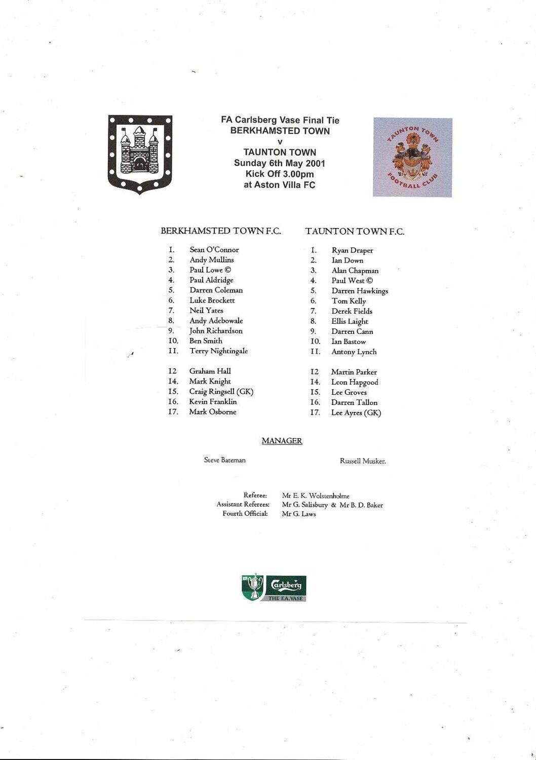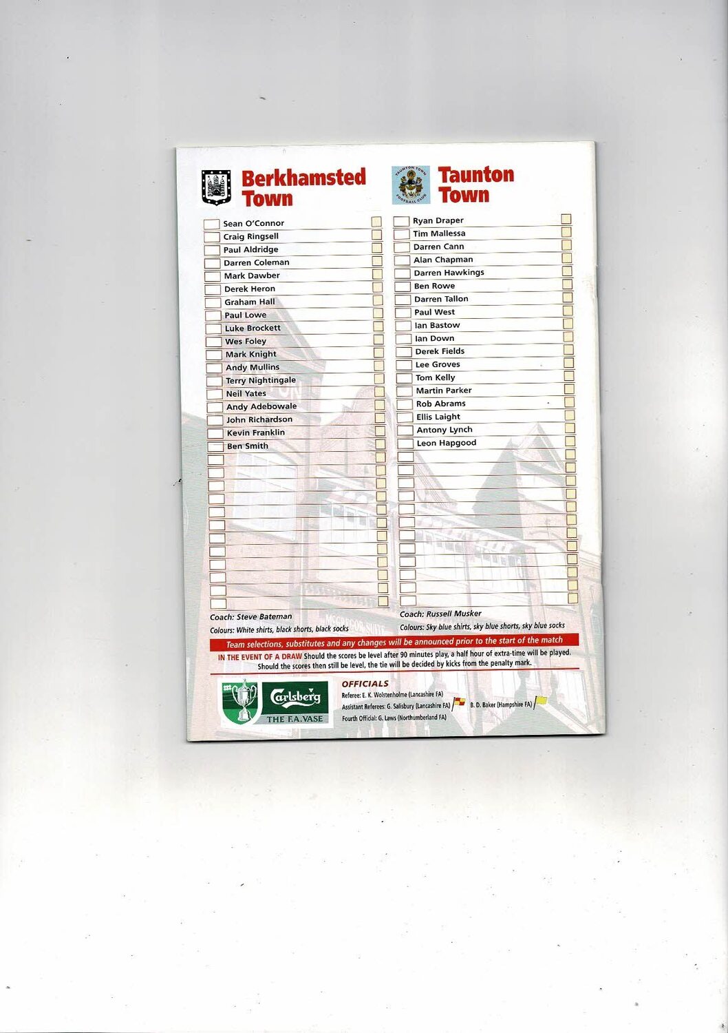 2001 Berkhamsted Town v Taunton Town FA Vase Final Football Programme & Team Sheet