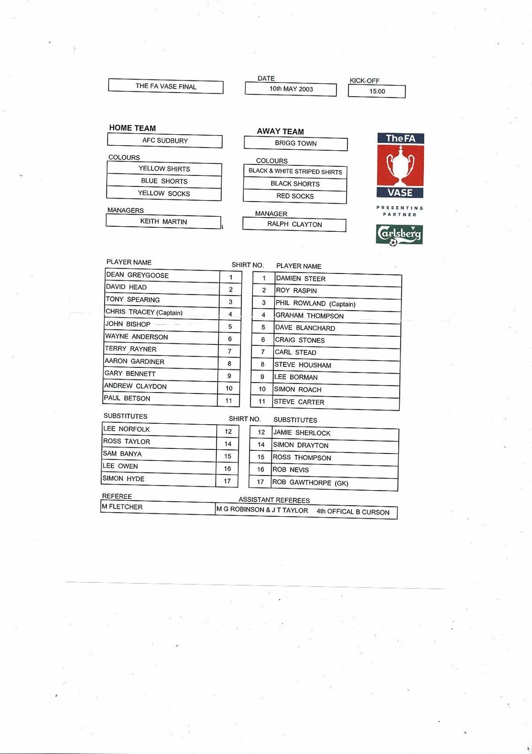 2003 Sudbury v Brigg Town Vase Final Football Programme & Team Sheet