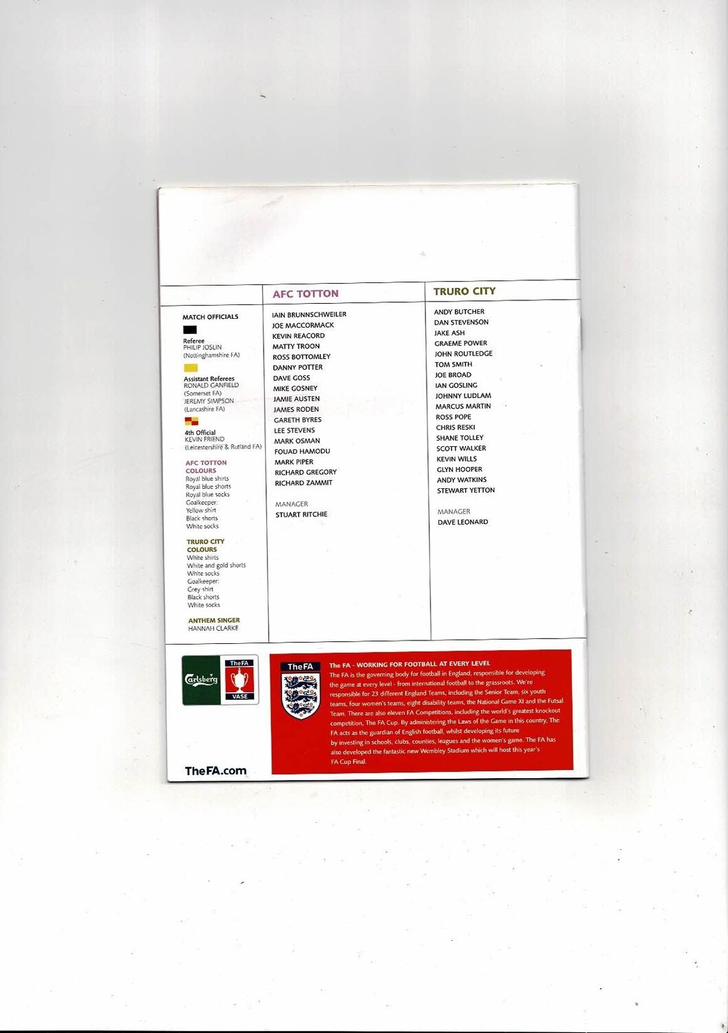 2007 AFC Totton v Truro City FA Vase Final Football Programme