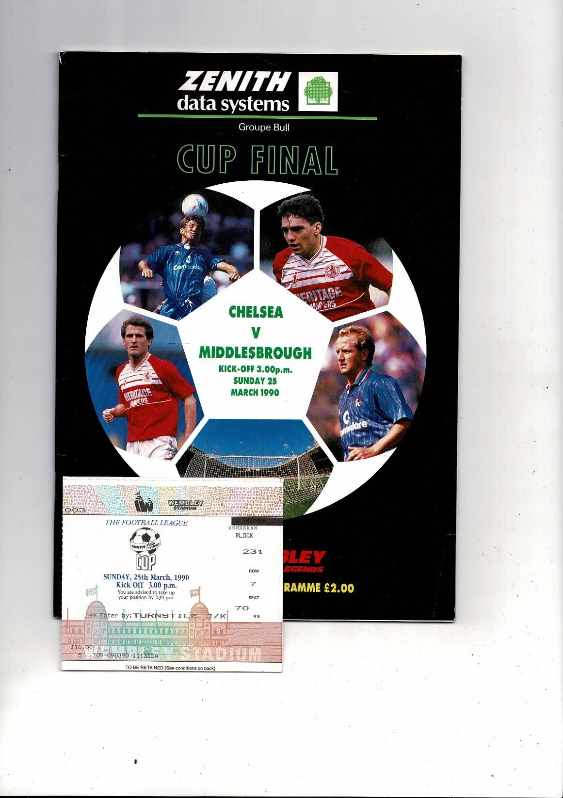 1990 Chelsea v Middlesbrough Zenith Data Cup Final Football Programme + Ticket