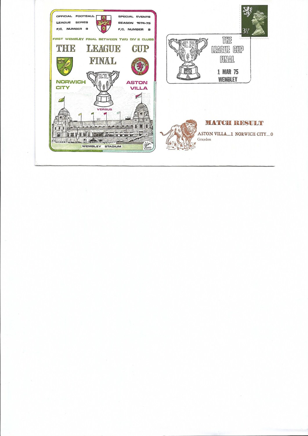 Aston Villa v Norwich City Football First Day Cover League Cup Final 1975