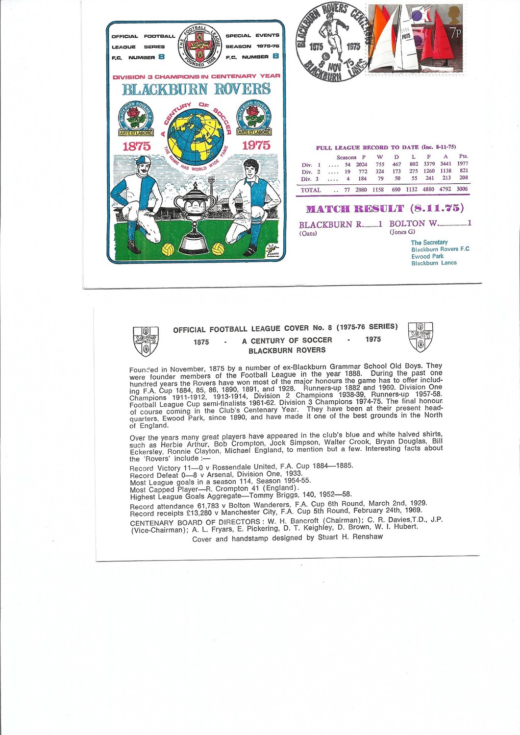 Blackburn Rovers v Bolton Wanderers Football First Day Cover + Insert Centenary Year 1975