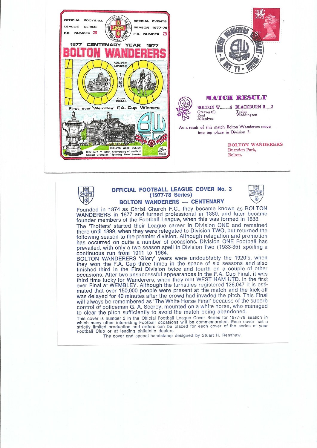 Bolton Wanderers v Blackburn Rovers Football First Day Cover + Insert Centenary Year 1977