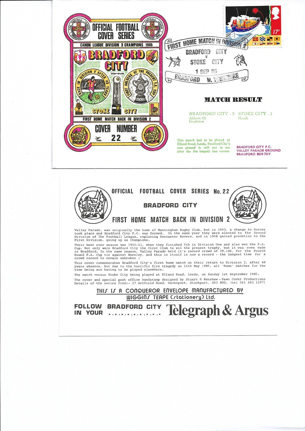 Bradford City v Stoke City Football First Day Cover + Insert 1985