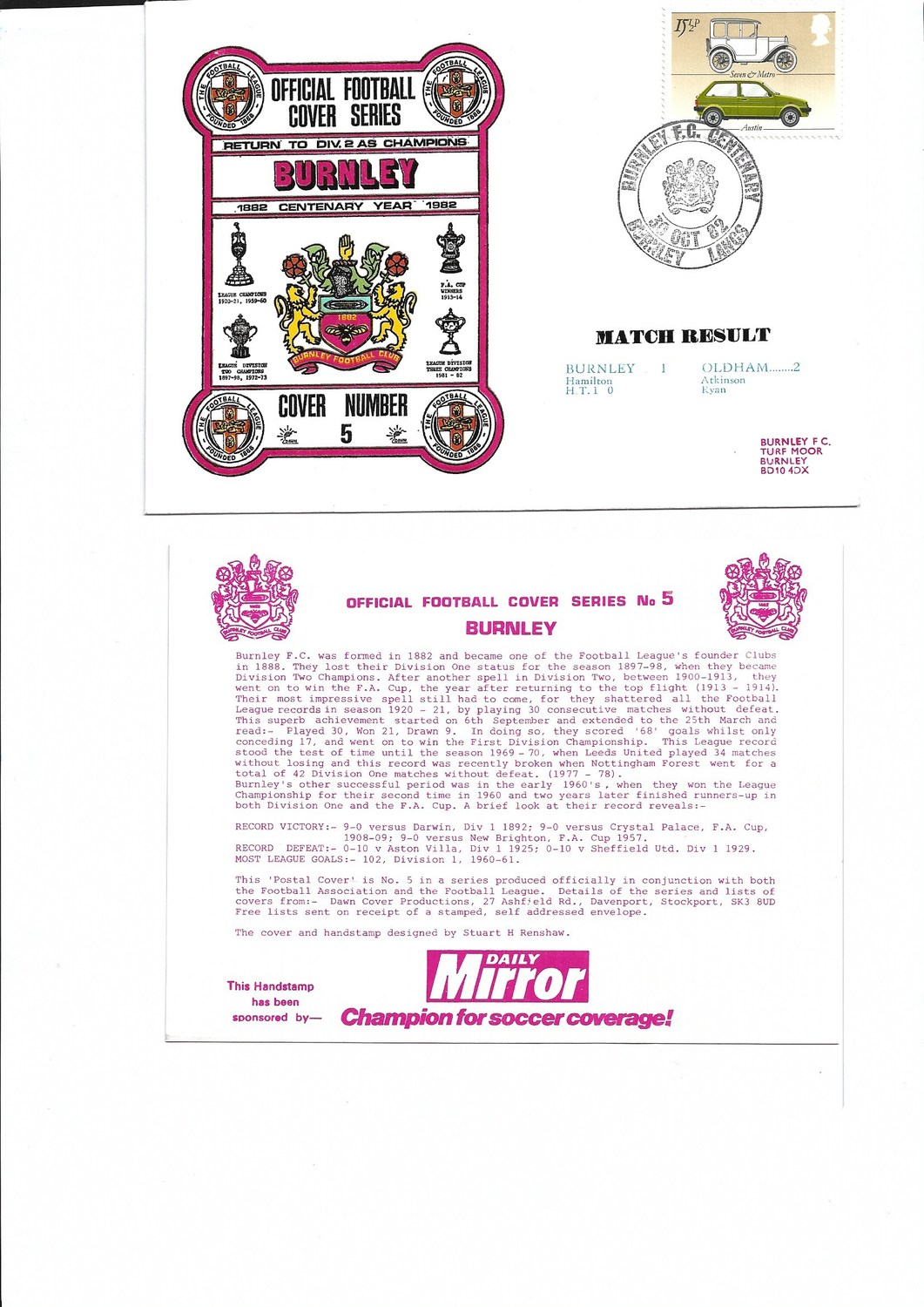 Burnley v Oldham Athletic Football First Day Cover + Insert 1982