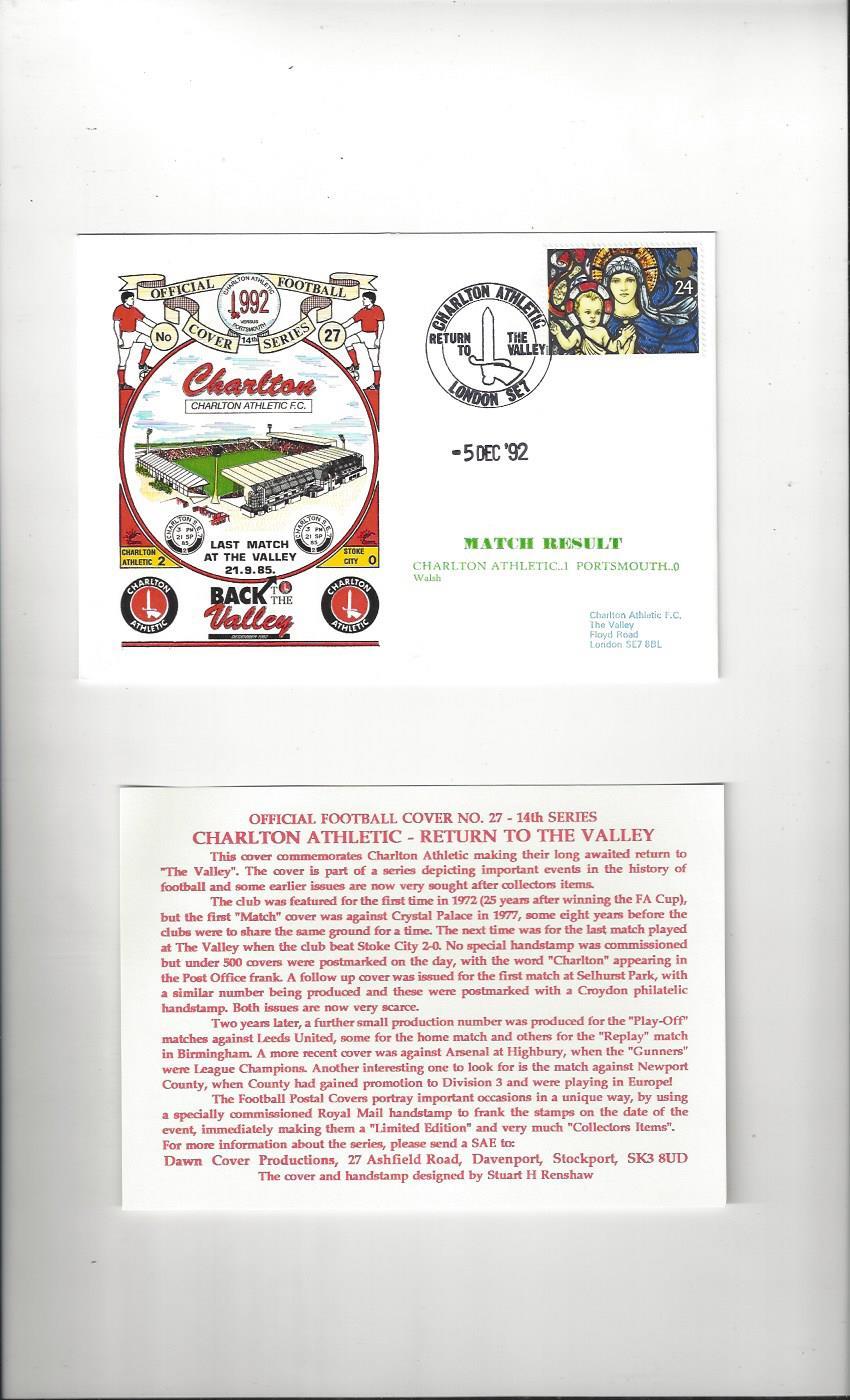 Charlton Athletic v Portsmouth Football First Day Cover + Insert 1992
