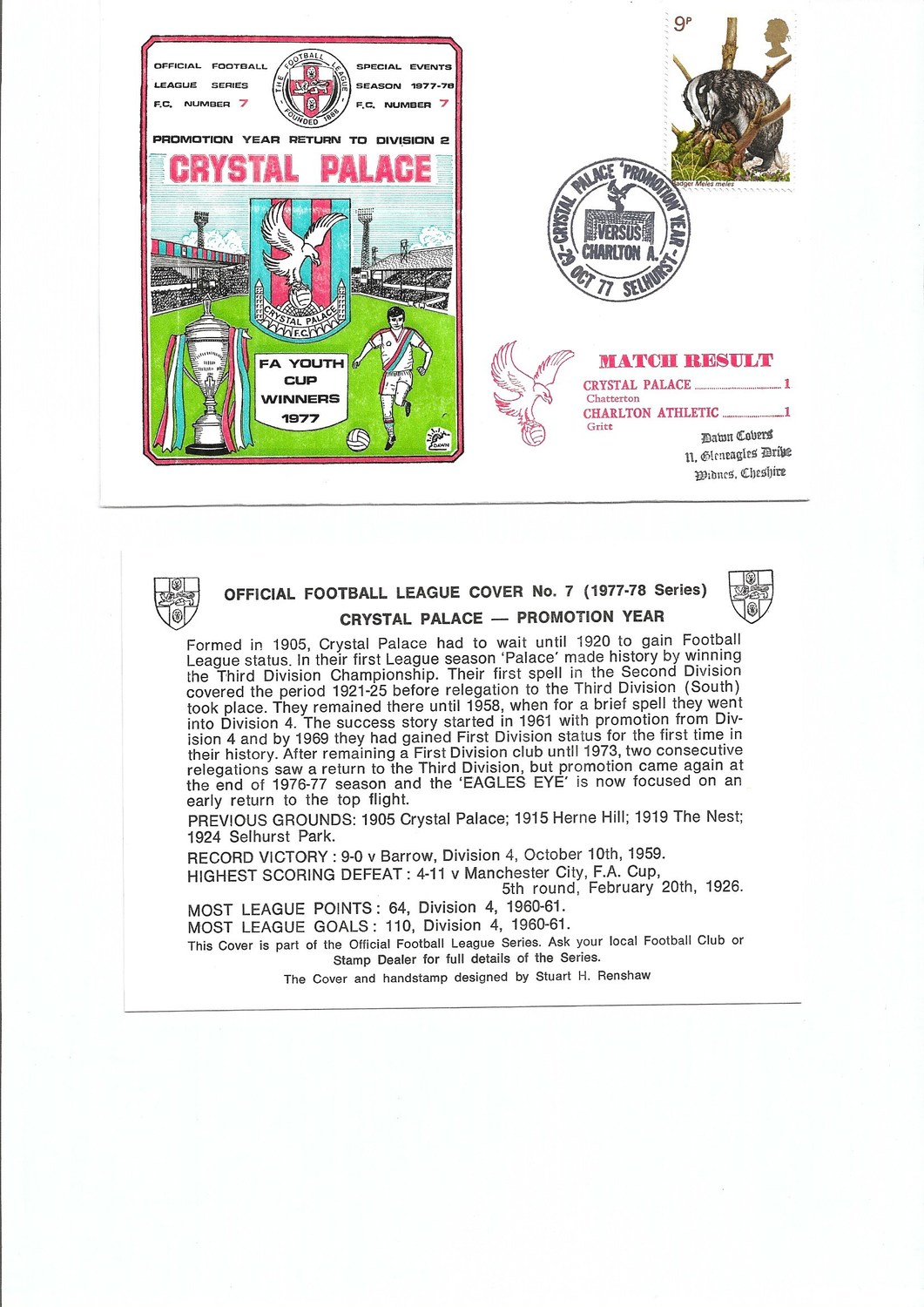 Crystal Palace v Charlton Athletic Football First Day Cover + Insert 1977