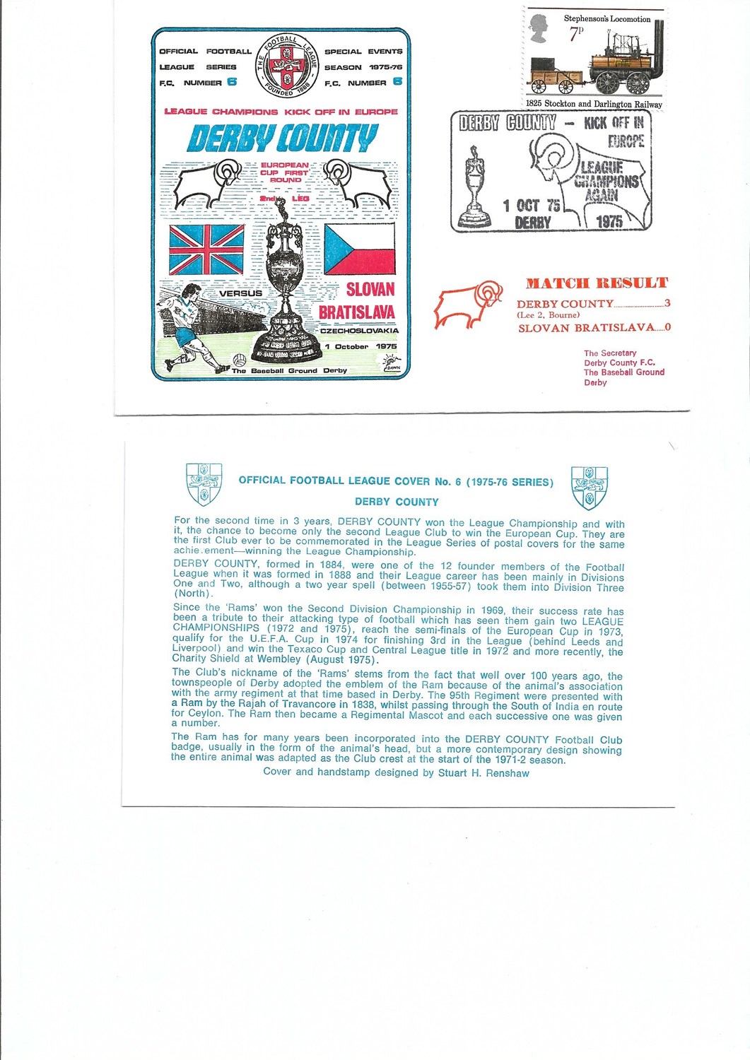Derby County v Slovan Bratislava Football First Day Cover + Insert European Cup 1975