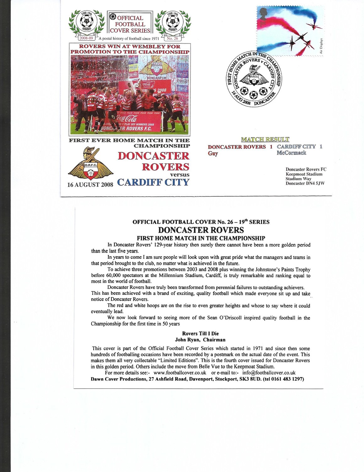 Doncaster Rovers v Cardiff City Football First Day Cover + Insert 2008