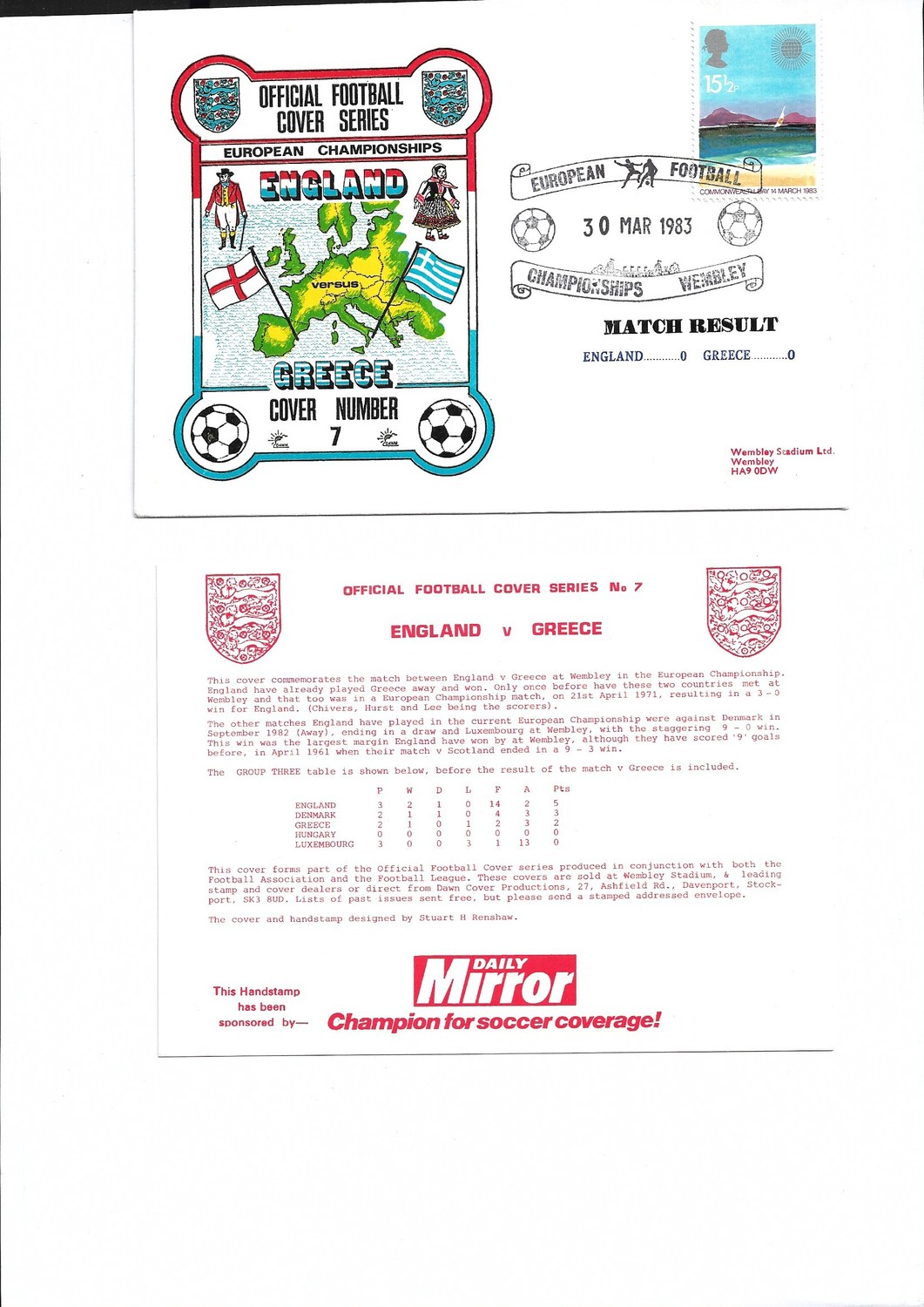 England v Greece Football First Day Cover + Insert European Championships 1983