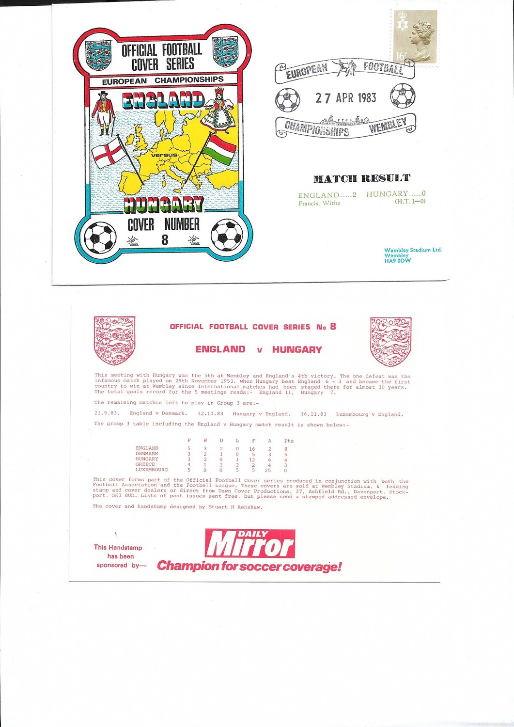 England v Hungary Football First Day Cover + Insert European Championships 1983
