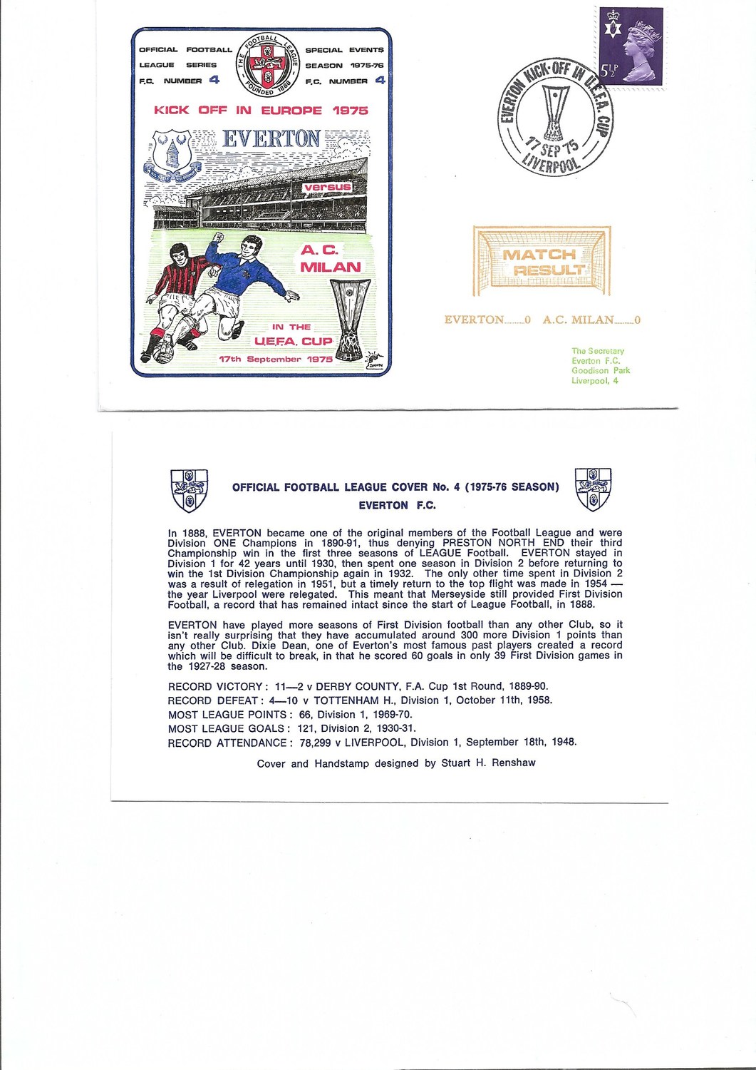 Everton v A.C Milan Football First Day Cover + Insert UEFA Cup 1975
