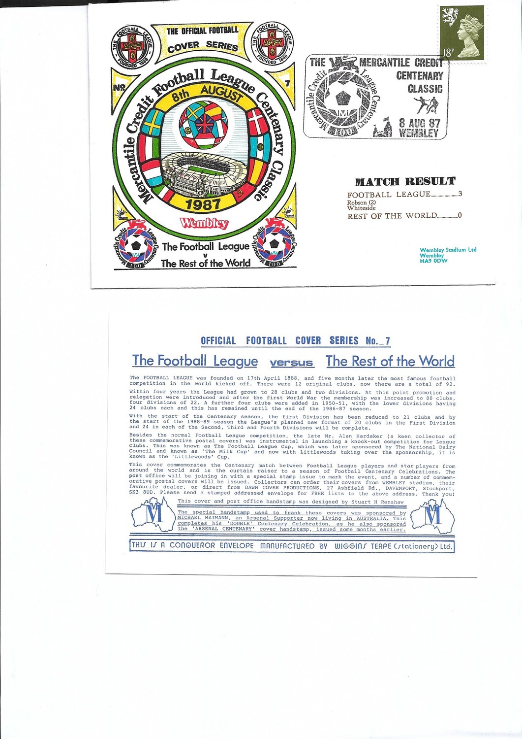 Football League v Rest of the world Football First Day Cover + Insert 1987