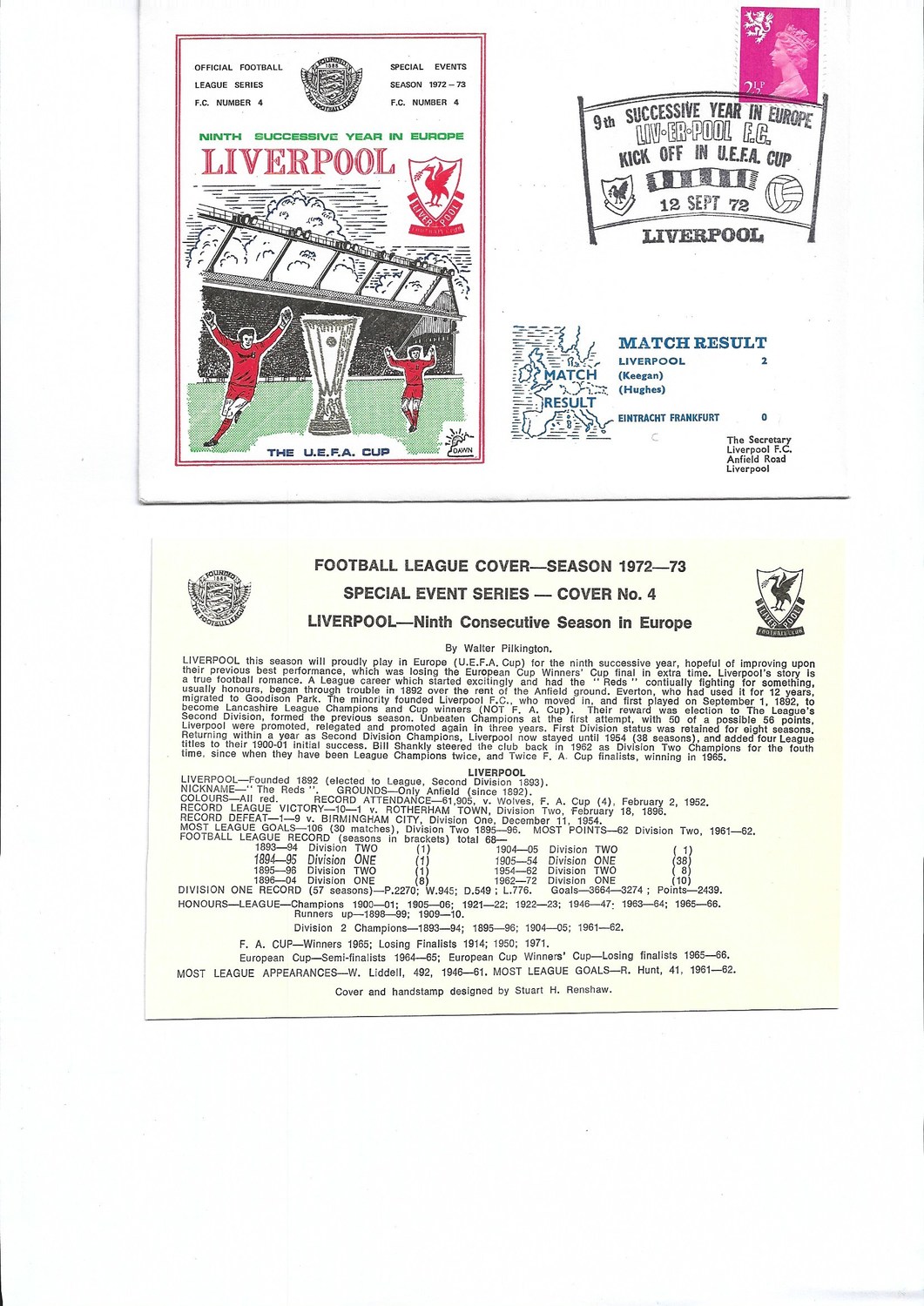 Liverpool v Eintracht Frankfurt Football First Day Cover + Insert UEFA Cup 1972