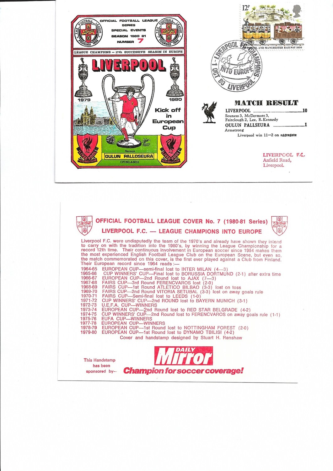 Liverpool v Oulun Palloseura Football First Day Cover + Insert European Cup 1980