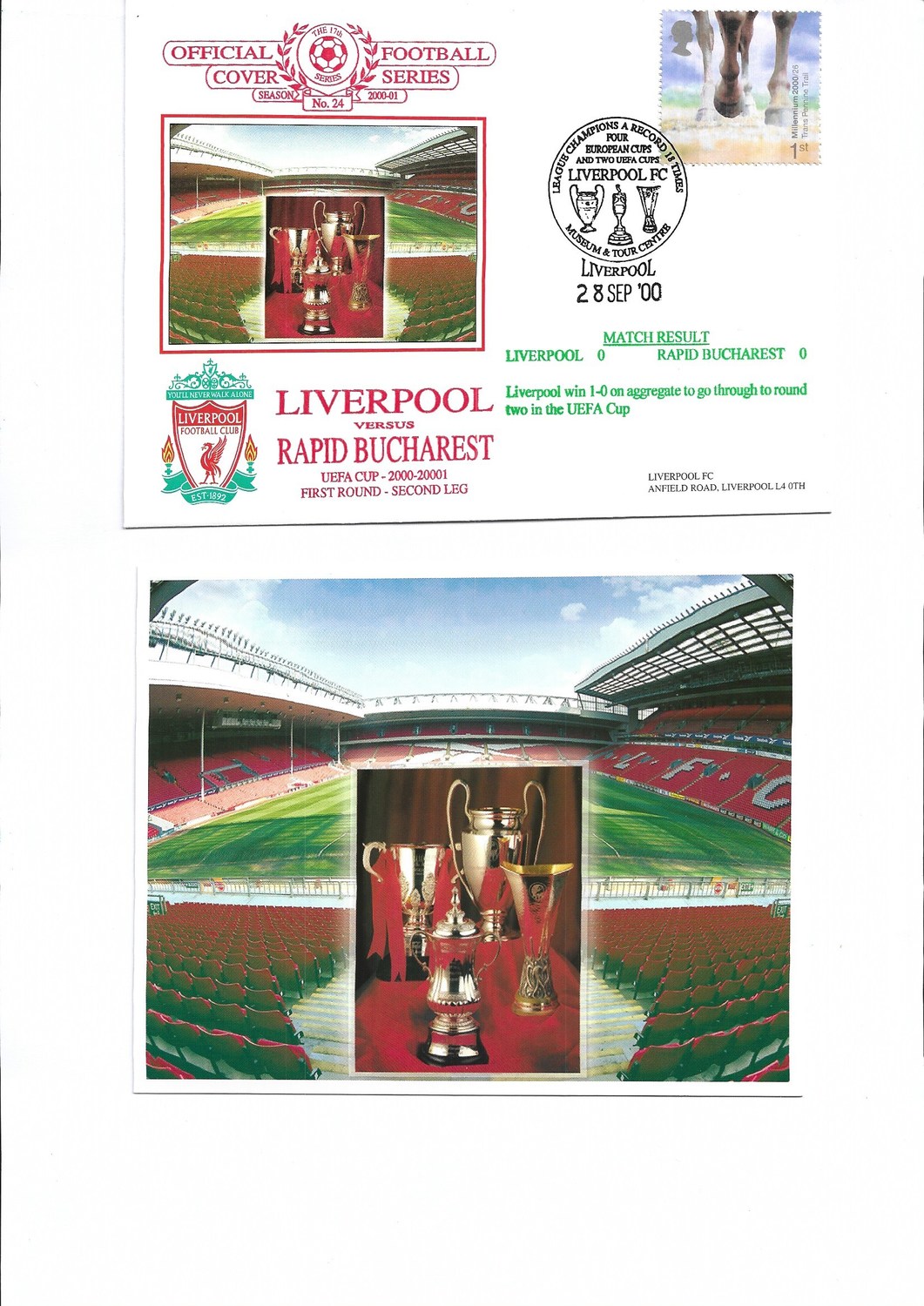 Liverpool v Rapid Bucharest Football First Day Cover + Insert UEFA Cup 2000