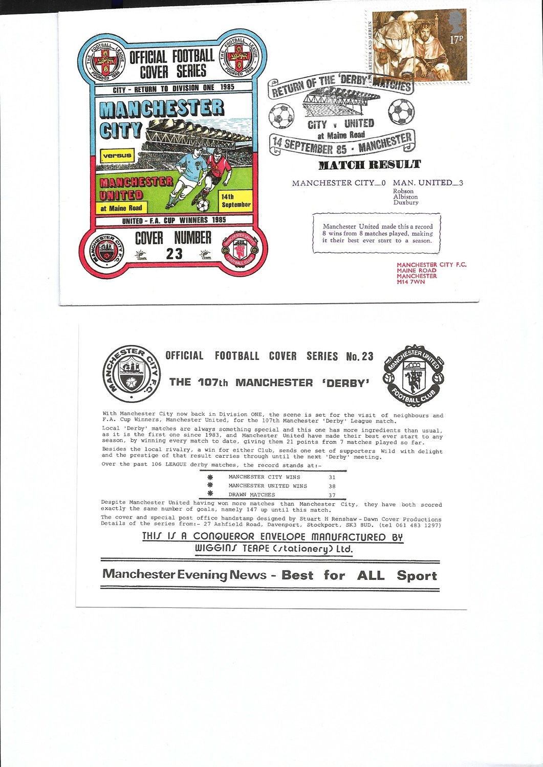 Manchester City v Manchester United Football First Day Cover + Insert 1985