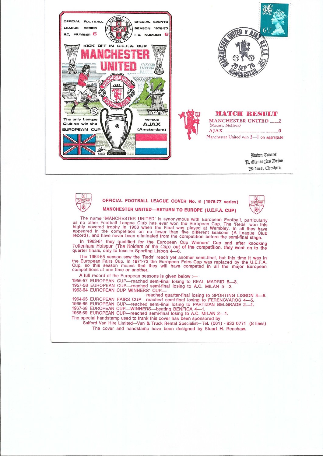 Manchester United v Ajax Football First Day Cover + Insert UEFA Cup 1976