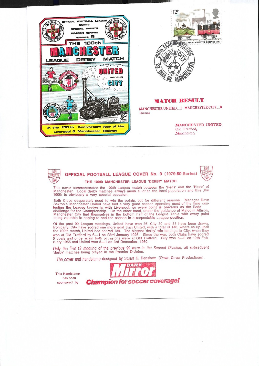 Manchester United v Manchester City Football First Day Cover + Insert 1980