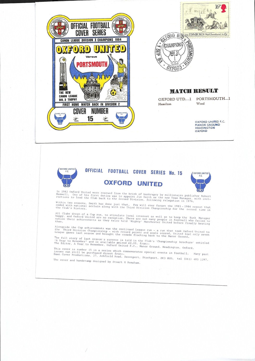 Oxford United v Portsmouth Football First Day Cover + Insert 1984
