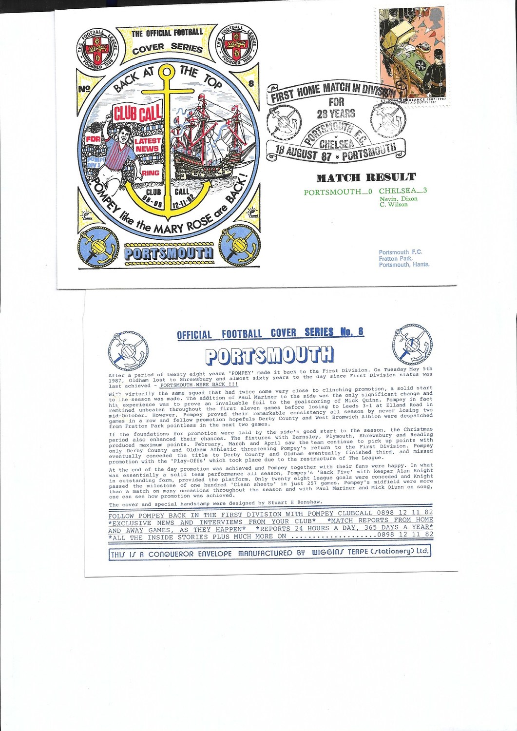 Portsmouth v Chelsea Football First Day Cover + Insert 1987