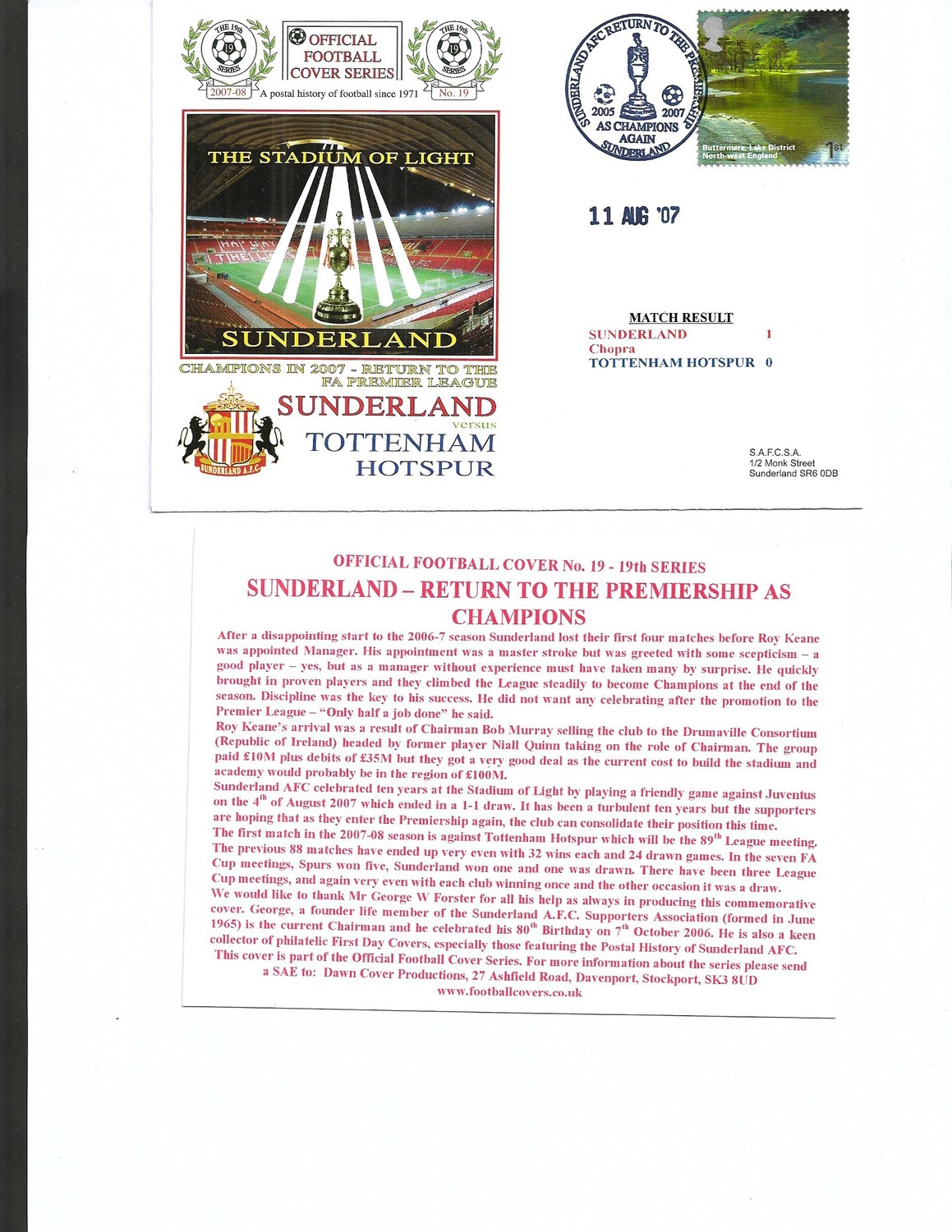 Sunderland v Tottenham Hotspur Football First Day Cover + Insert 2007