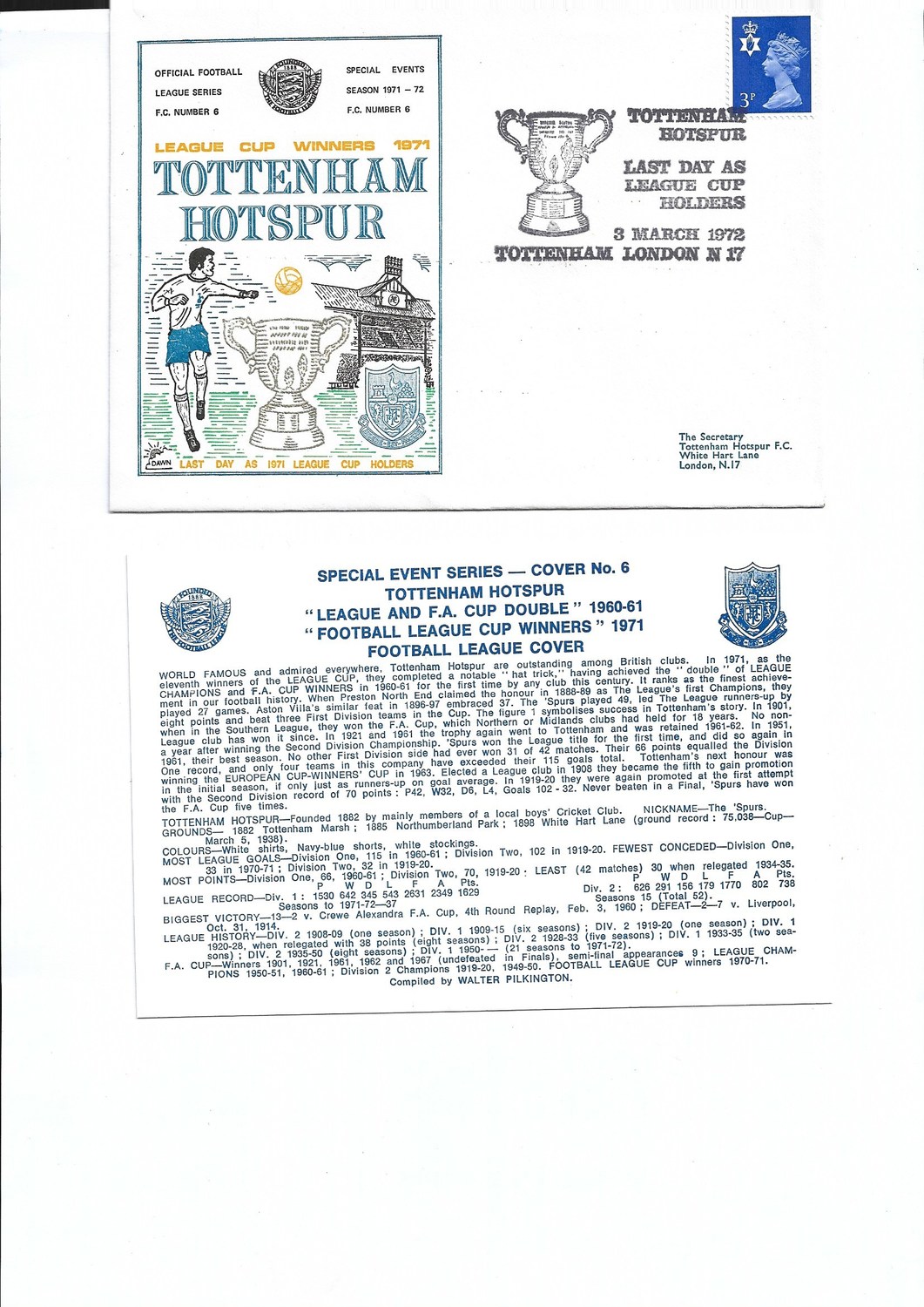 Tottenham Hotspur Football First Day Cover + Insert Last day as League Cup Holders 1972