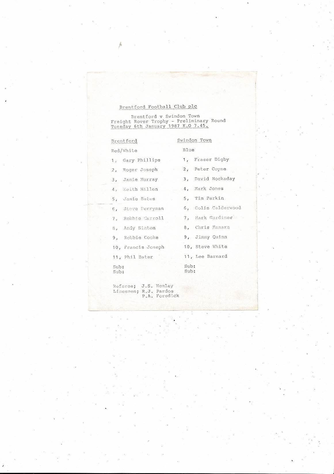 1986/87 Brentford v Swindon Town Freight Rover Trophy Football Team Sheet
