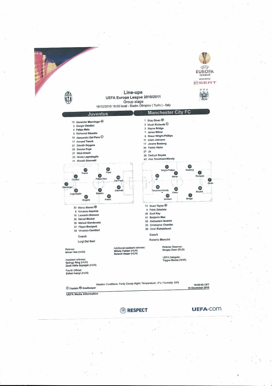 Juventus FC v Manchester City Europa League Team Sheet 2010/11