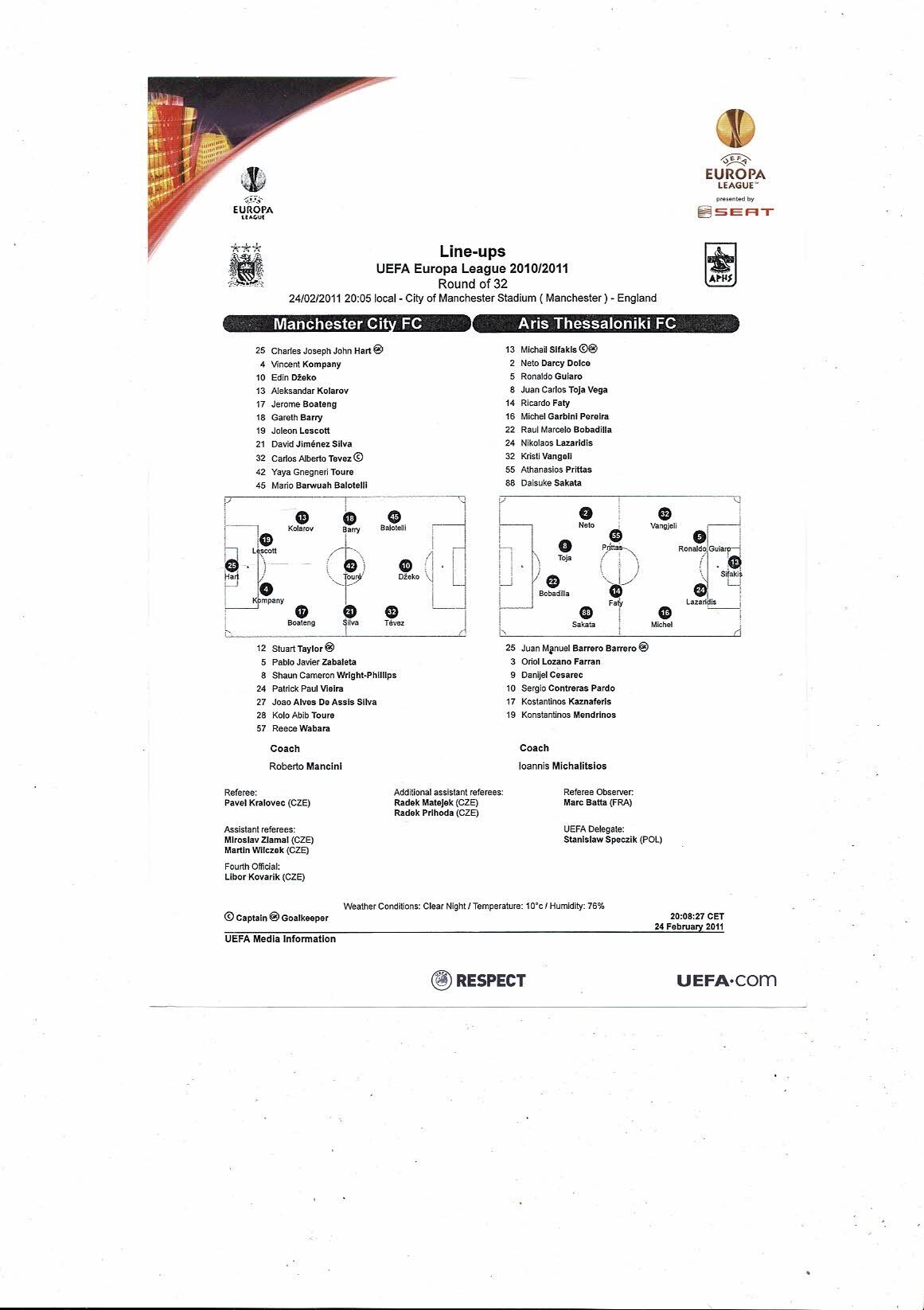 Manchester City v Aris Thessalonika FC Europe League Team Sheet 2010/11