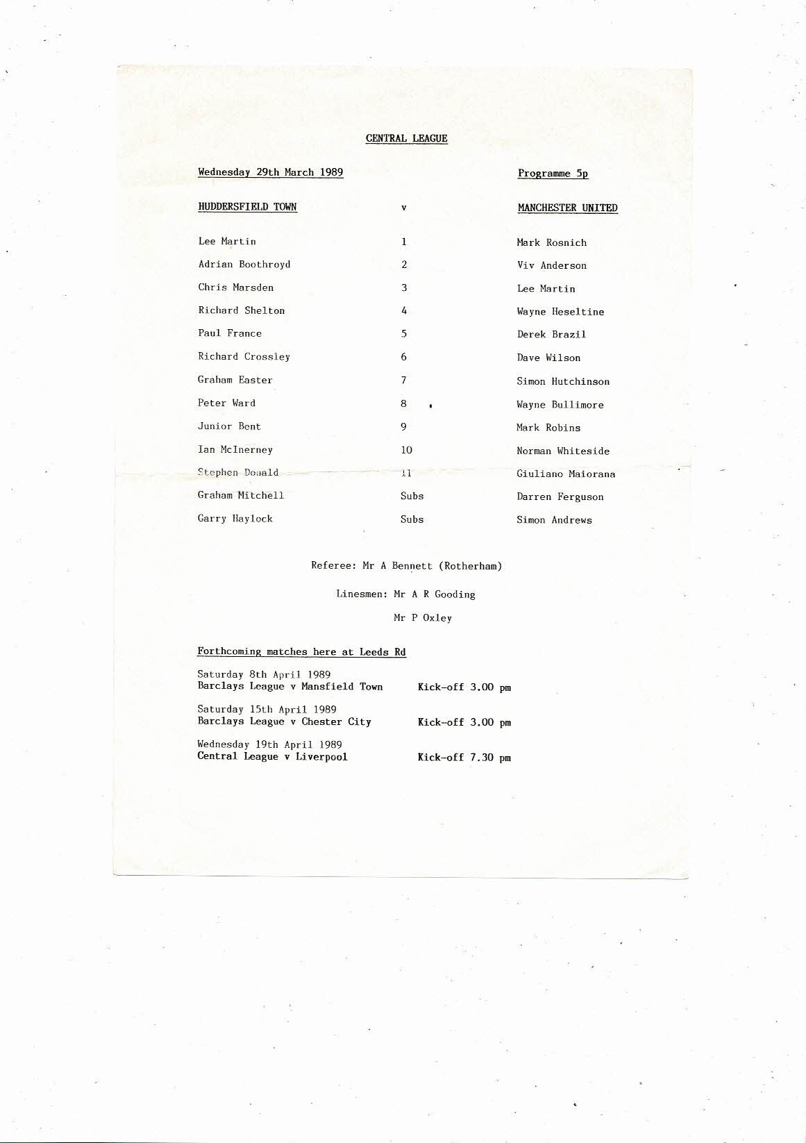 Huddersfield Town v Manchester United Central League Football Programme 1988/89